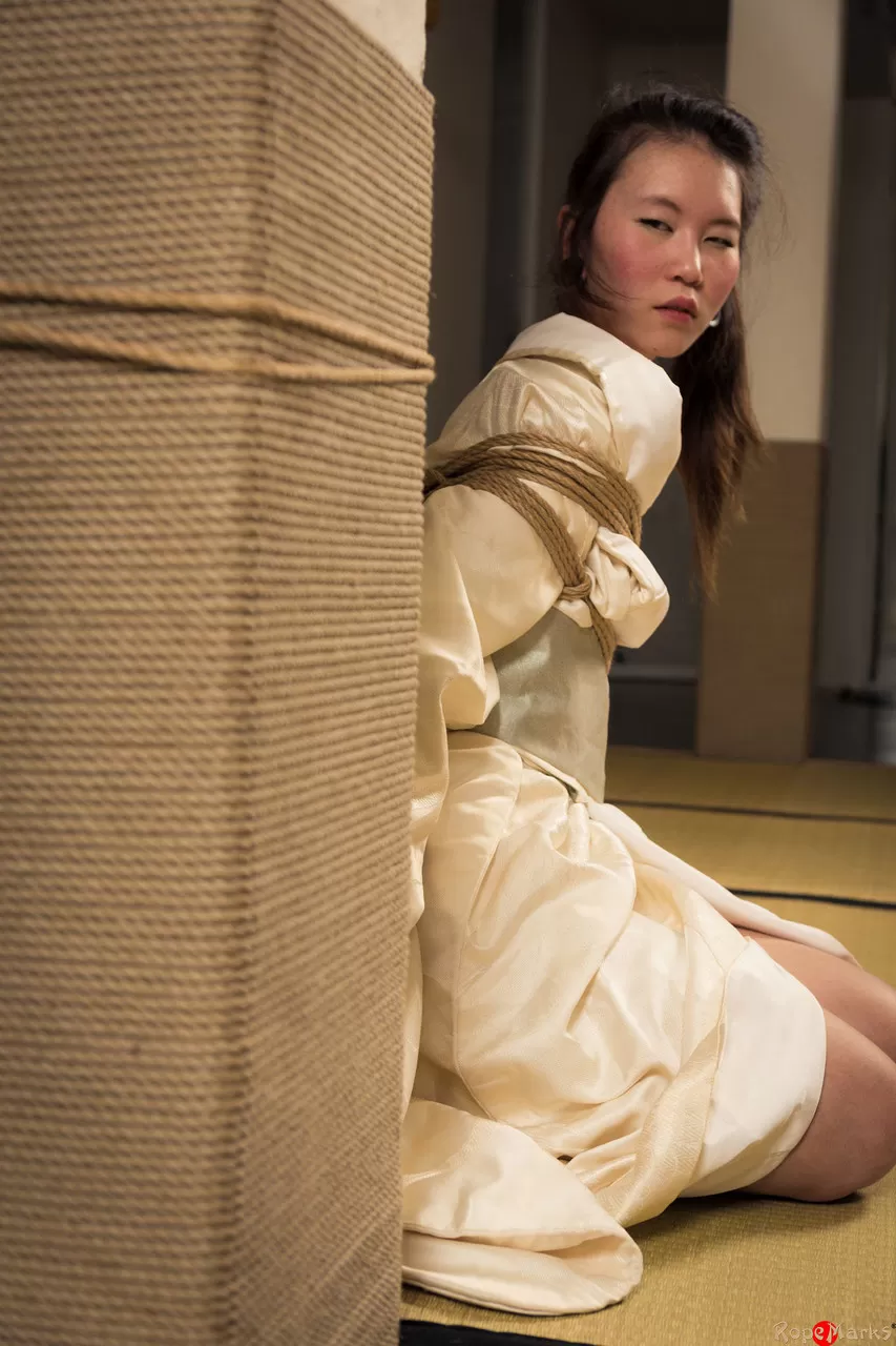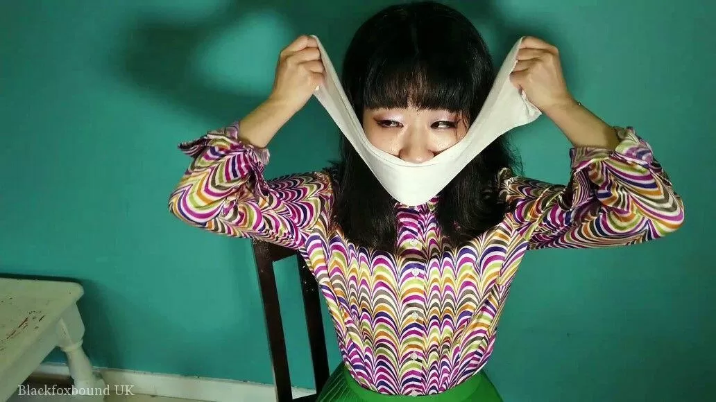 - 4. Азиатская девушка Безупречное Мяу связана веревкой на лужайке с кляпом во рту.