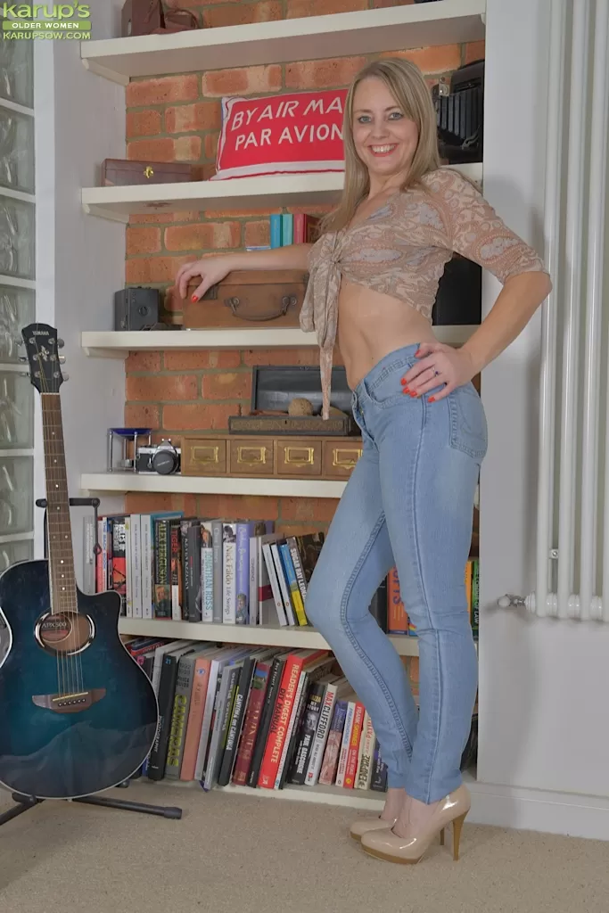 - 1. Сладострастная зрелая красотка обнажает свои сиськи и приспускает джинсы.