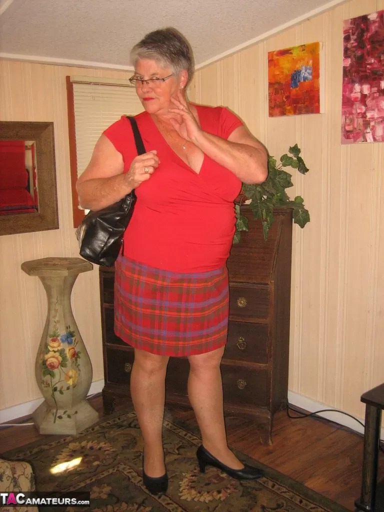 - 2. Пожилая женщина в юбке и черных чулках снимает блузку.