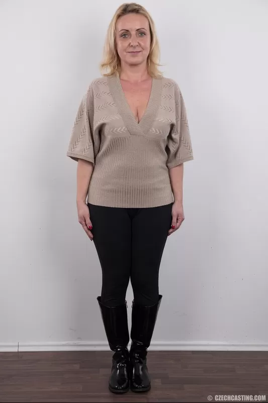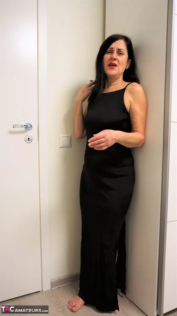 - 4. Зрелая дама в выцветших синих джинсах раздевается до своего черного нижнего белья.
