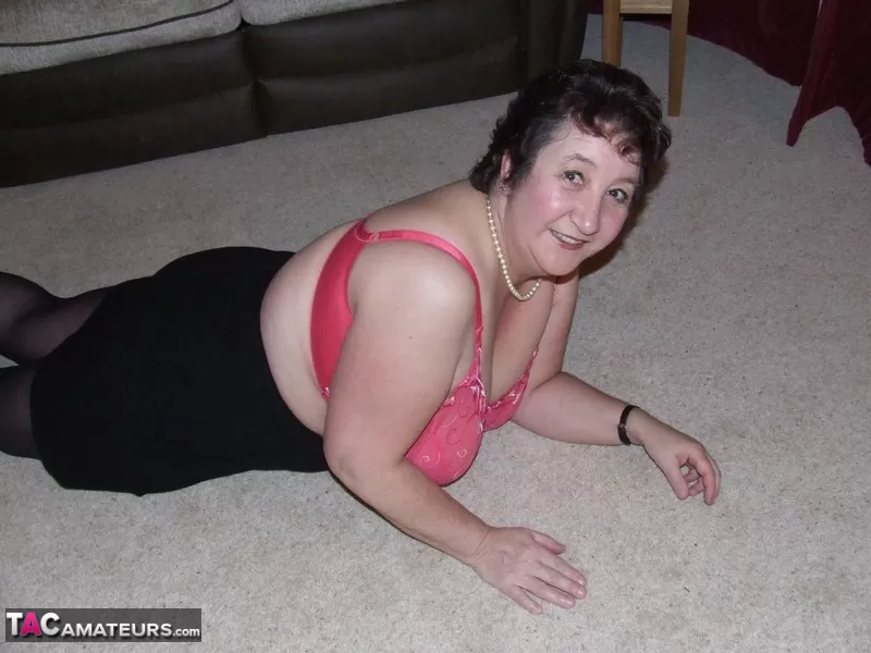 - 4. Толстая зрелая женщина Кудрявая Кэрол раздевается до нижнего белья и нейлоновых чулок.