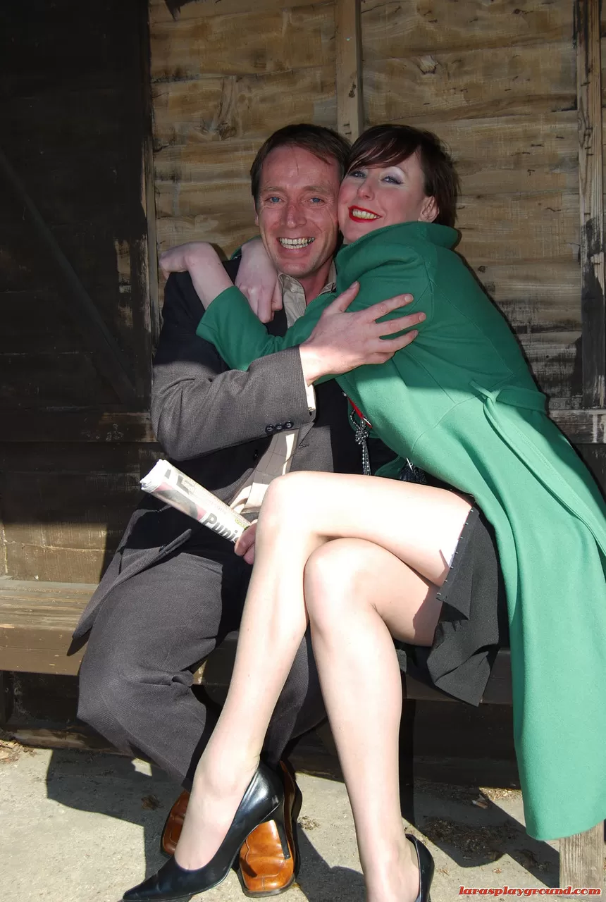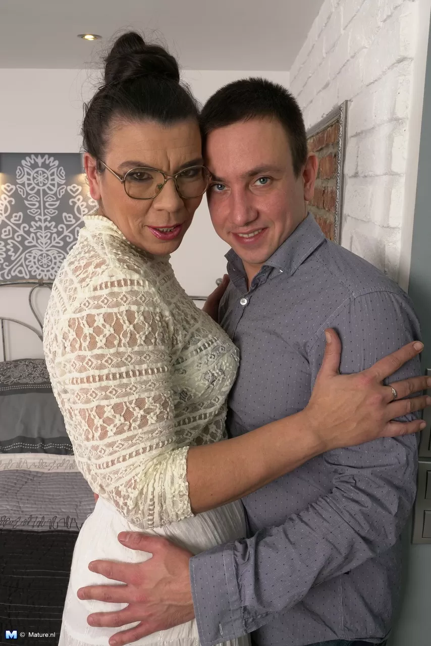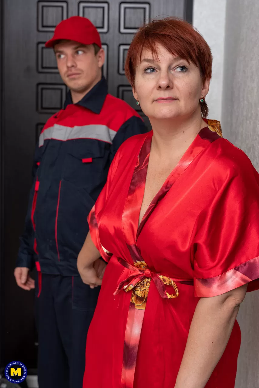 - 2. Зрелая дама с короткими рыжими волосами соблазняет своего пасынка на диване.