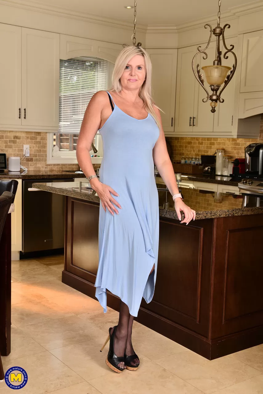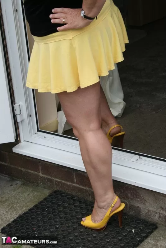 - 2. Зрелая леди Сатин Джейд находит творческие способы продемонстрировать свои нейлоновые чулки под юбкой.