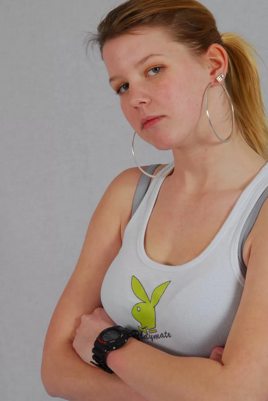 - 4. Рыжеволосая студентка Фрейя Х. обнажает свои маленькие сиськи в фиолетовых чулках и подвязках.