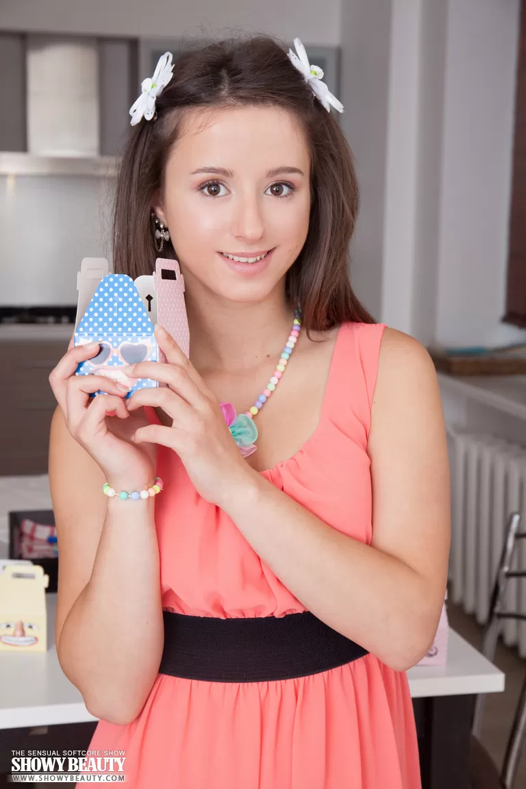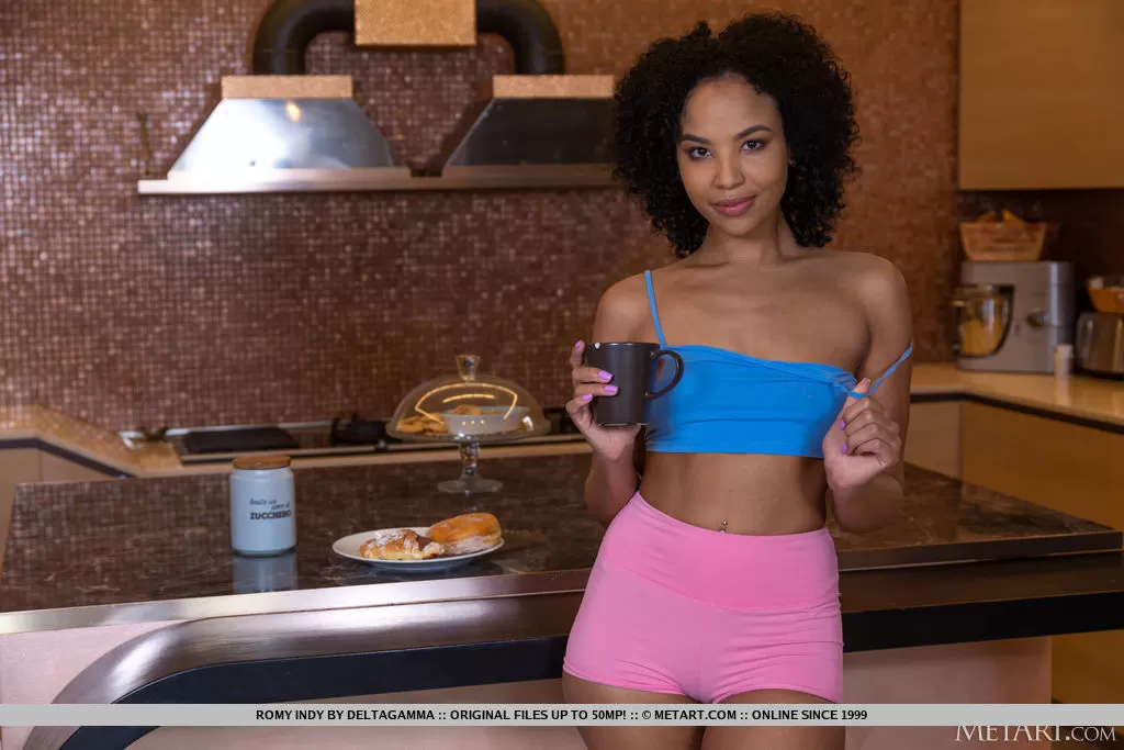 - 1. Гламурная модель обнажает шикарную молоденькую попку и большие натуральные сиськи на кухне.