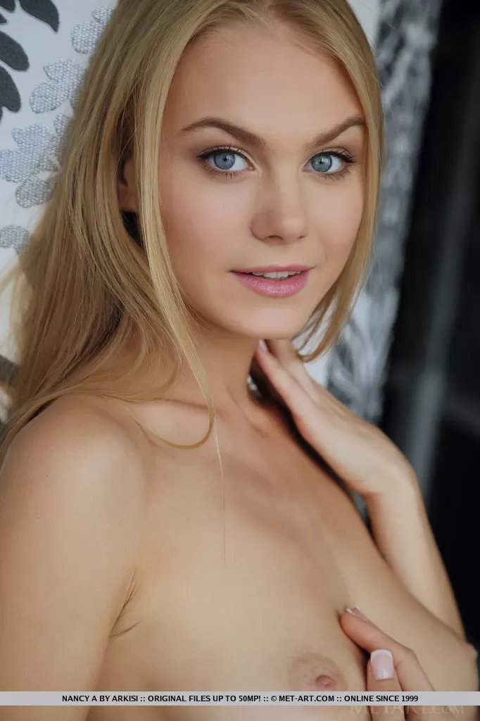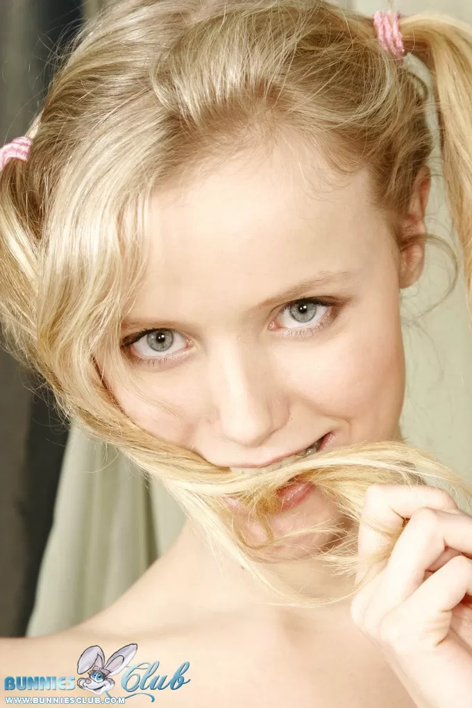 - 2. Молодо выглядящая блондинка Яна заплетает волосы в косички для своих первых обнаженных фотографий.