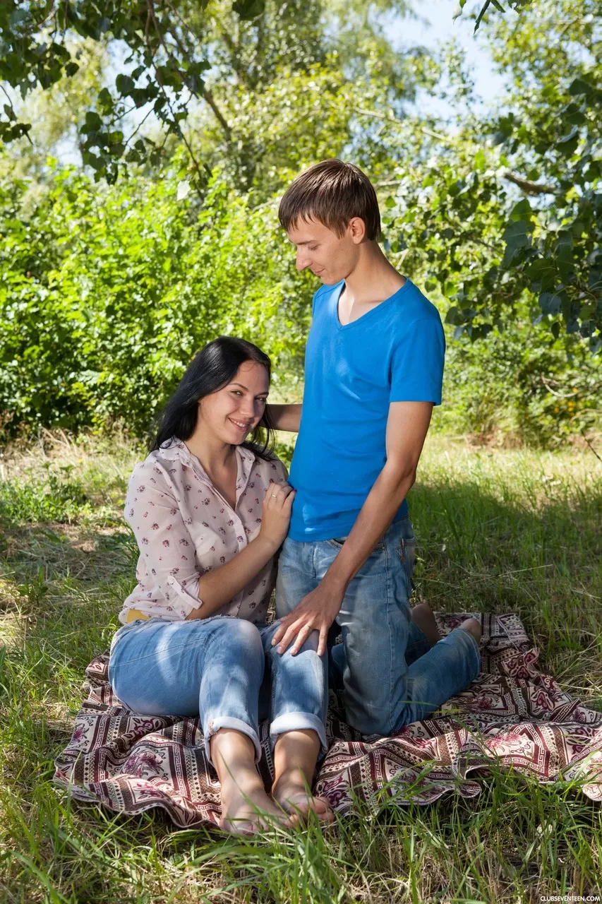 - 3. Молодая блондинка показывает свои трусики под юбкой на столе для пикника в кемпинге.