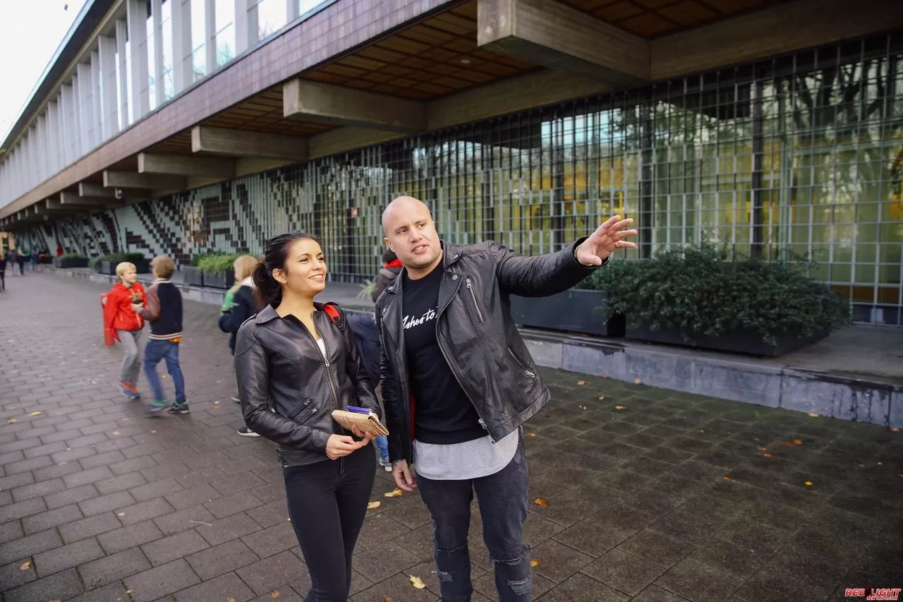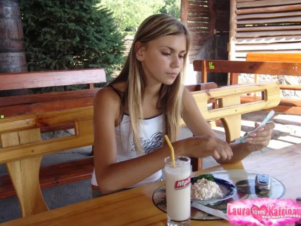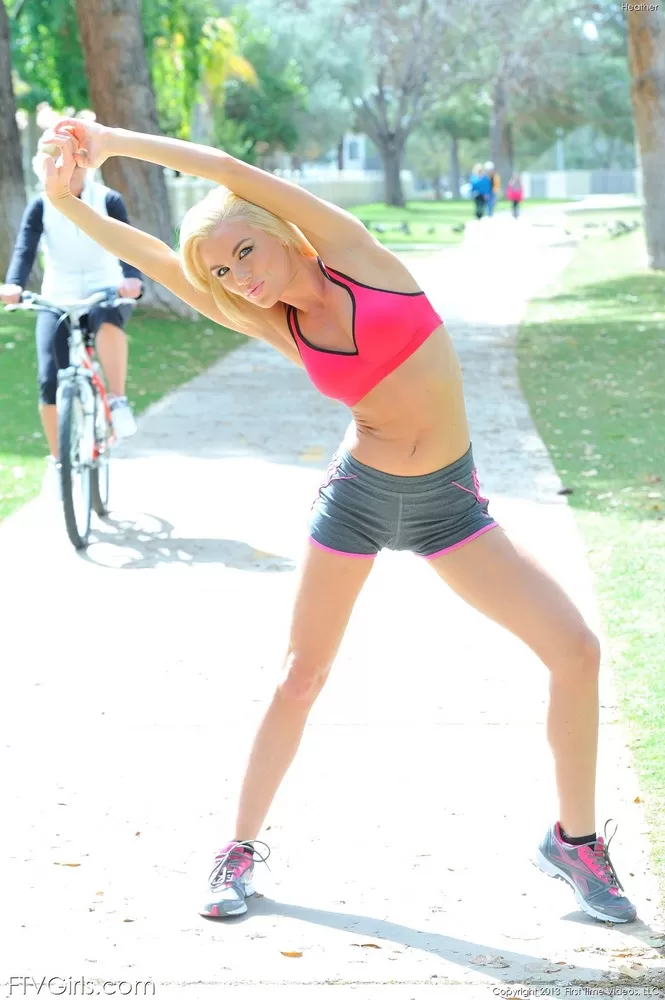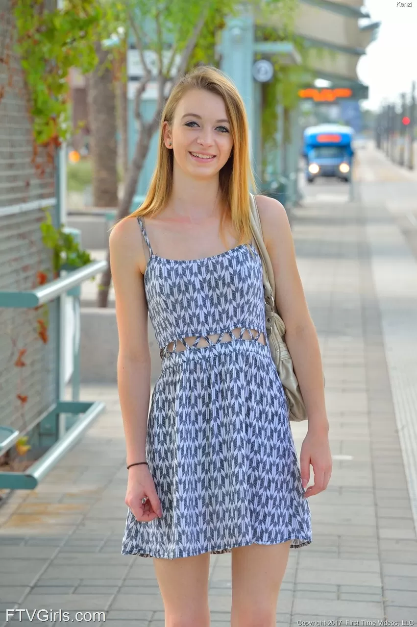 - 3. Миниатюрная блондинка сверкает своими сиськами и лысой пиздой, когда идет по тротуару.