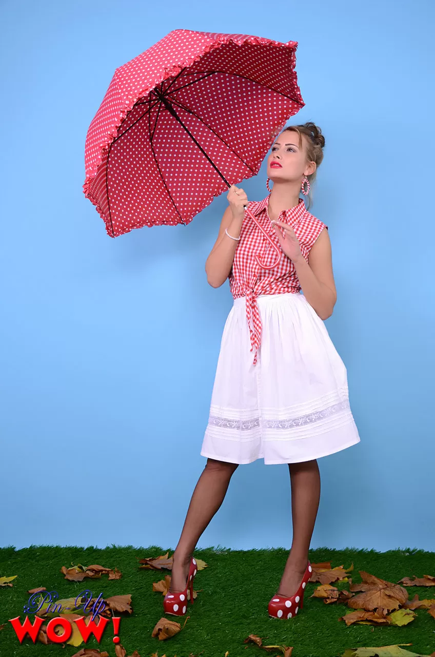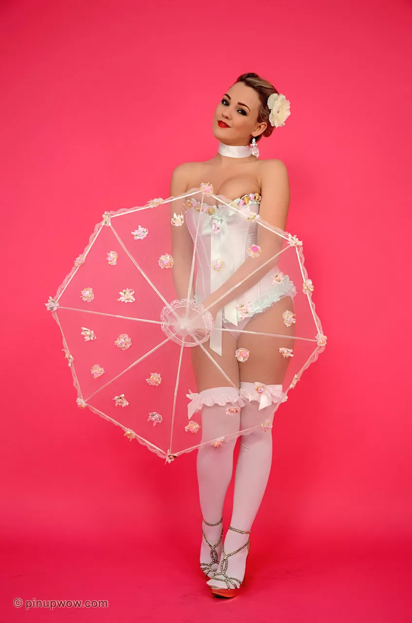 - 4. Длинноногая винтажная девушка в пинапе показывает горячие сиськи в чулках и корсете.