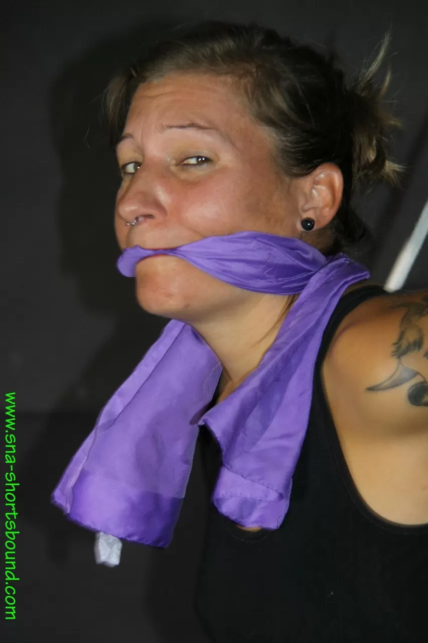 - 3. Татуированная девушка клив с кляпом во рту, удерживаемая в неудобной позе.