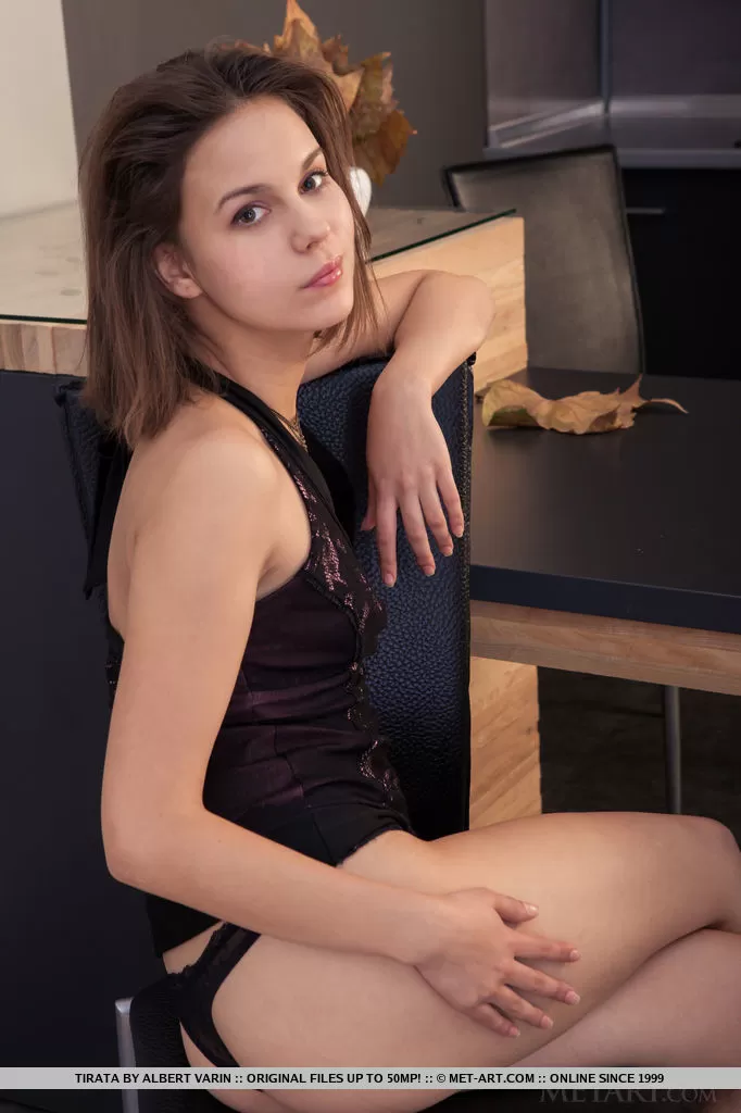 - 1. Худенькая девушка Миа Сандерс подчеркивает свою лысую киску в чулках винного оттенка.
