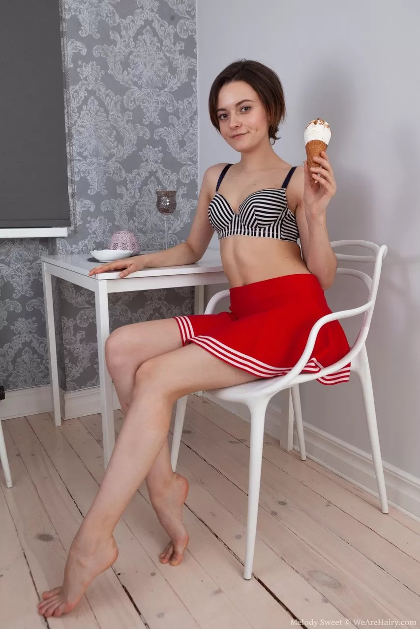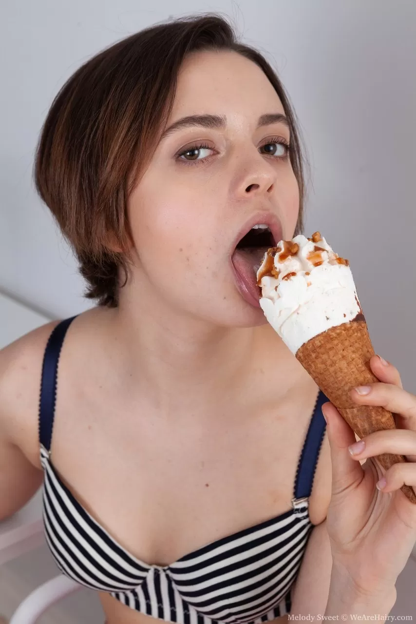 - 2. Босоногая любительница Мелоди Свит ест мороженое, прежде чем показать свой волосатый куст.
