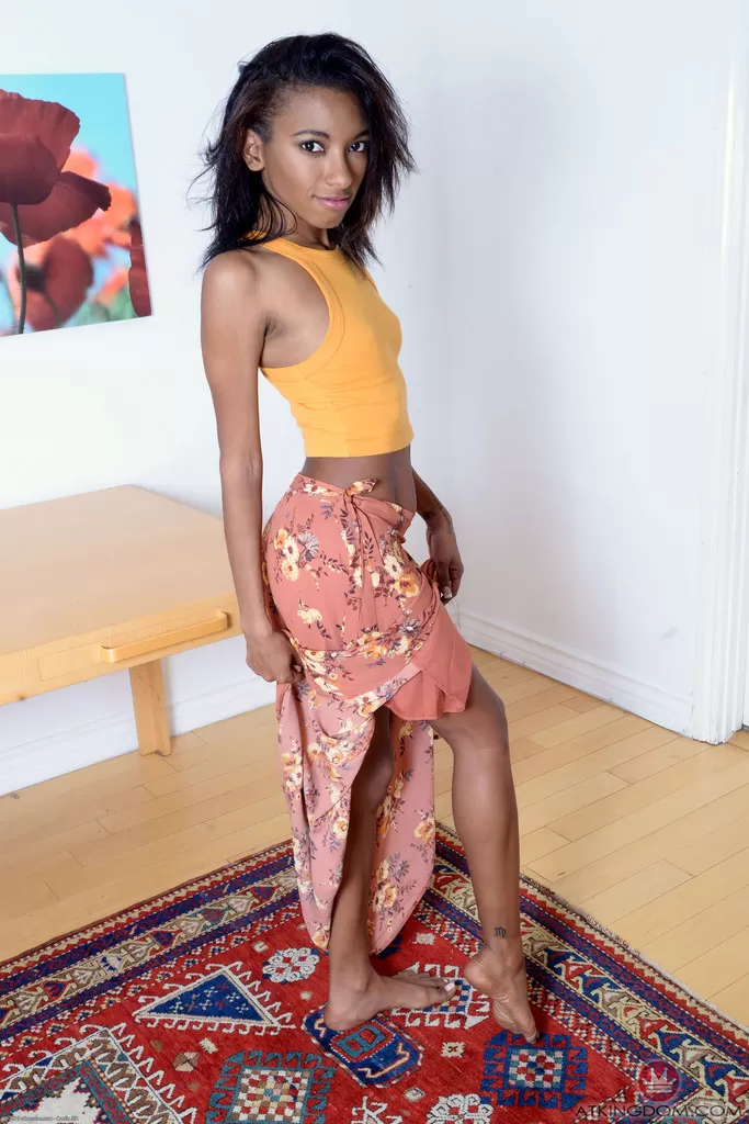 - 5. Молодая модель Далила Джи выскальзывает из своей микро юбки, чтобы позировать обнаженной.