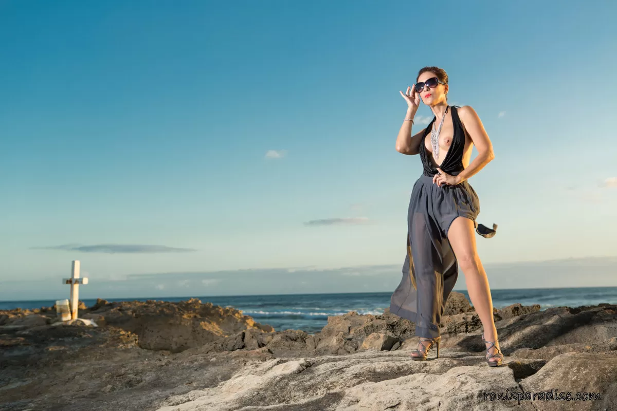 - 1. Одинокая девушка Фибби распускает волосы, позируя обнаженной в океане и на берегу.