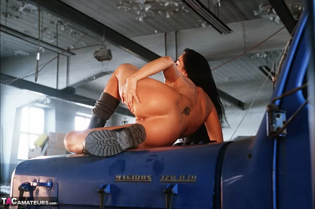 - 5. Отвисшая сиськастая сучка Мэри в сапогах до бедер обнажает большую татуированную задницу с пирсингом в киске.