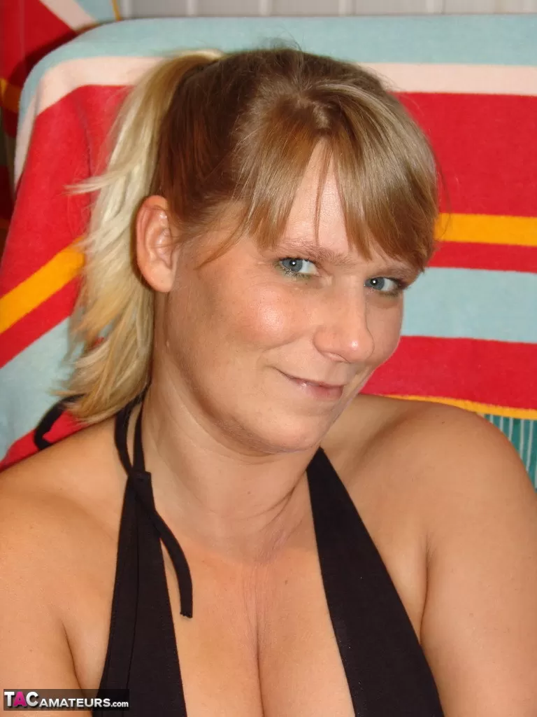 - 3. Пожилая блондинка Энн Свингер трет свою бритую киску во внутреннем дворике у бассейна.