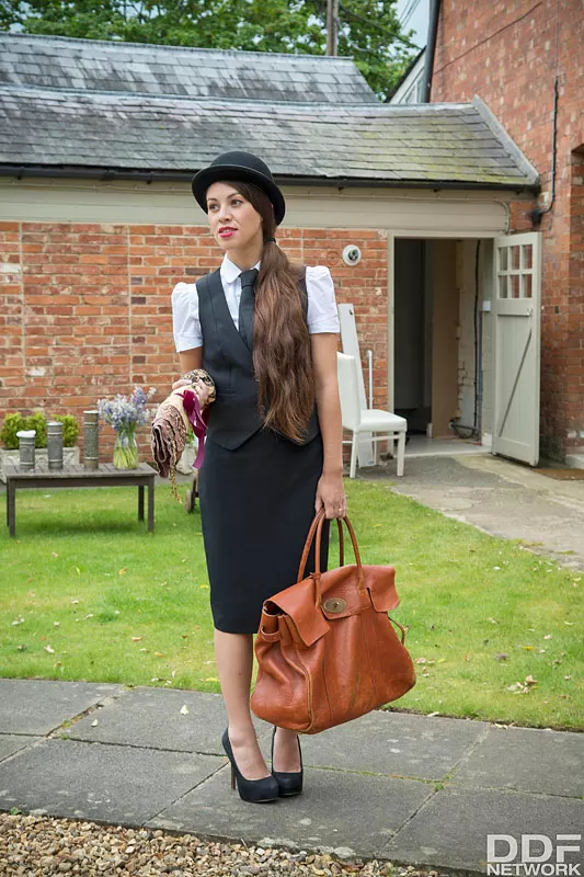 - 3. Темноволосая красотка Жасмин Джонс моделирует латексную униформу горничной в сексуальных чулках.