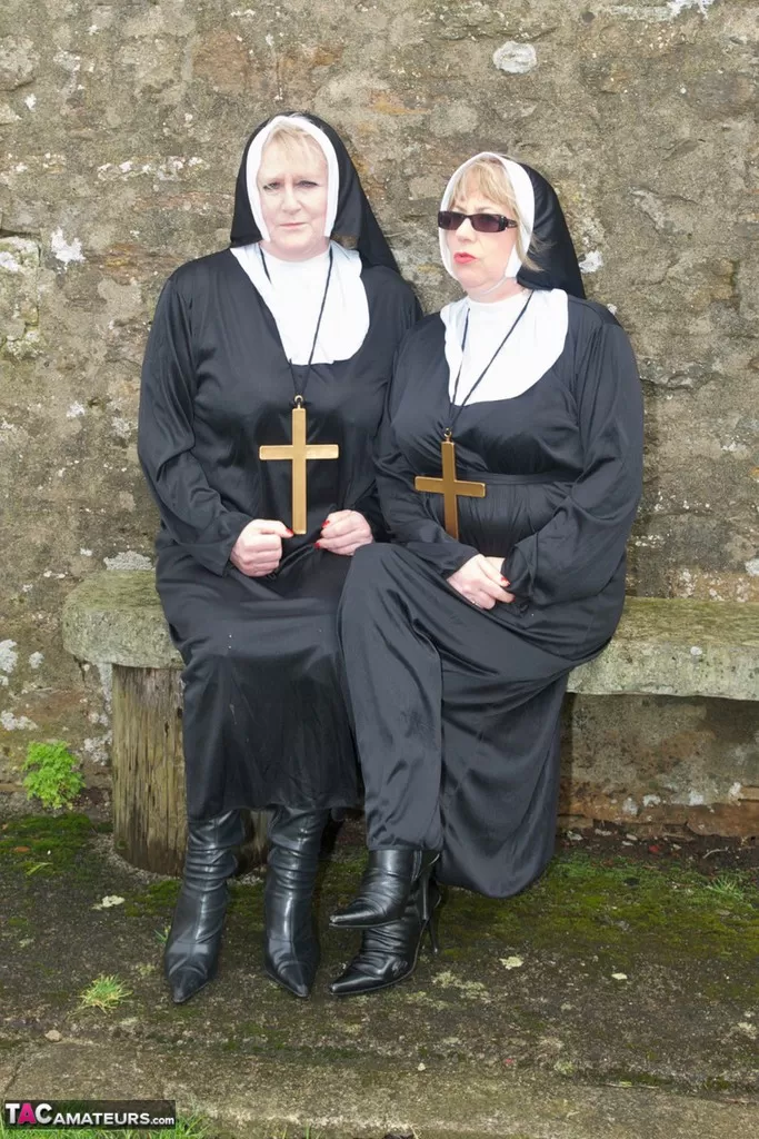 - 4. Пожилые любительские сочные модели демонстрируют свое великолепное тело перед старым деревом.