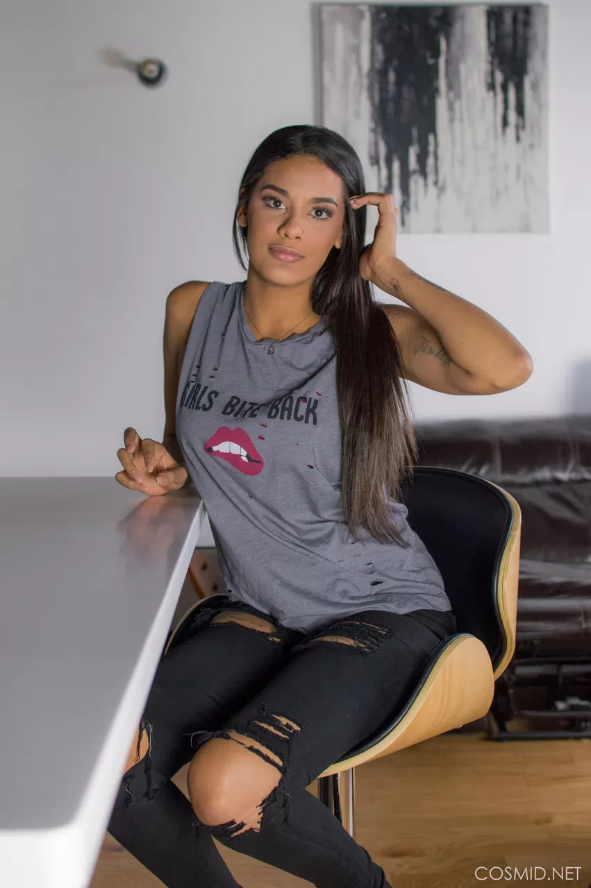 - 4. Молодая красотка сбрасывает рваные джинсы на пути к раздвиганию бритой вагины.