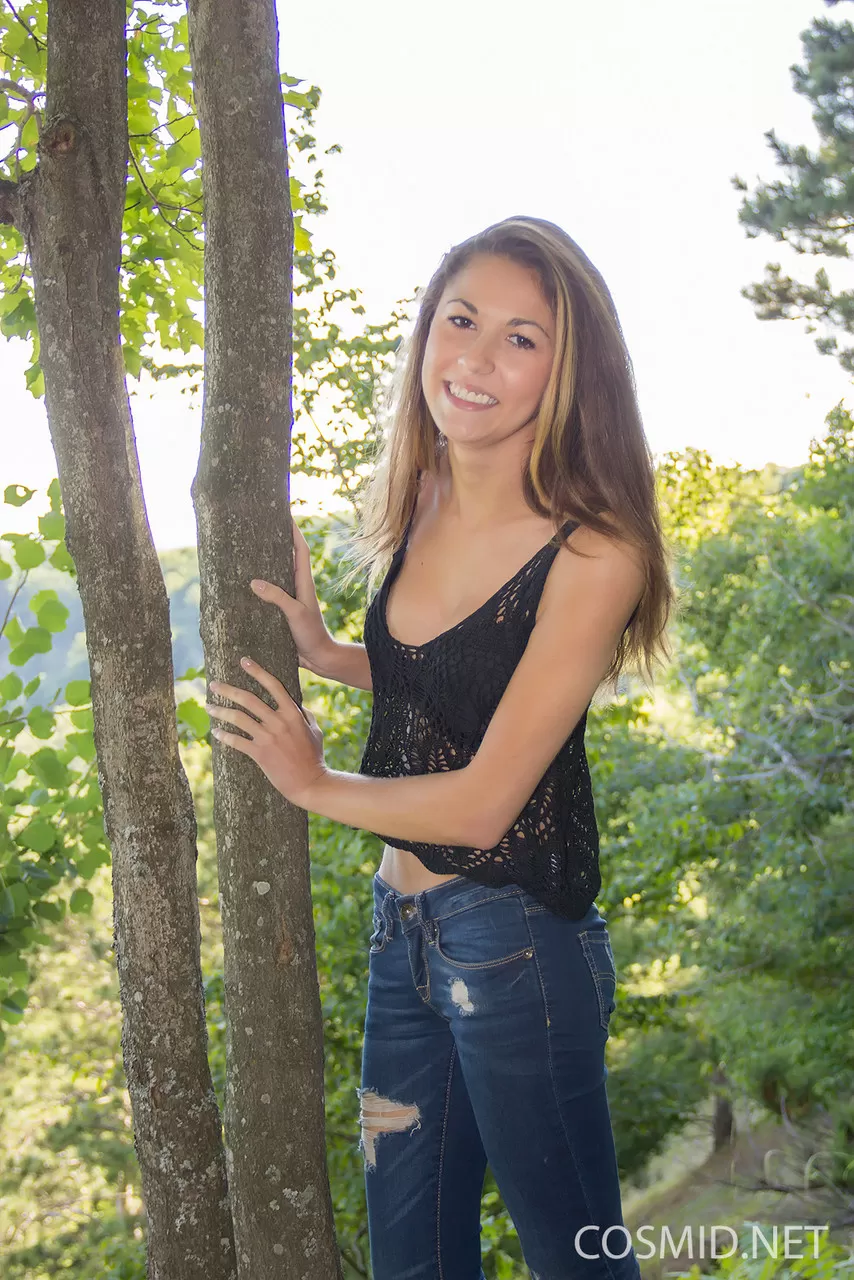 - 2. Брюнетка красотка в джинсах обнажает крошечные сиськи и лысую киску подростка во время раздевания.