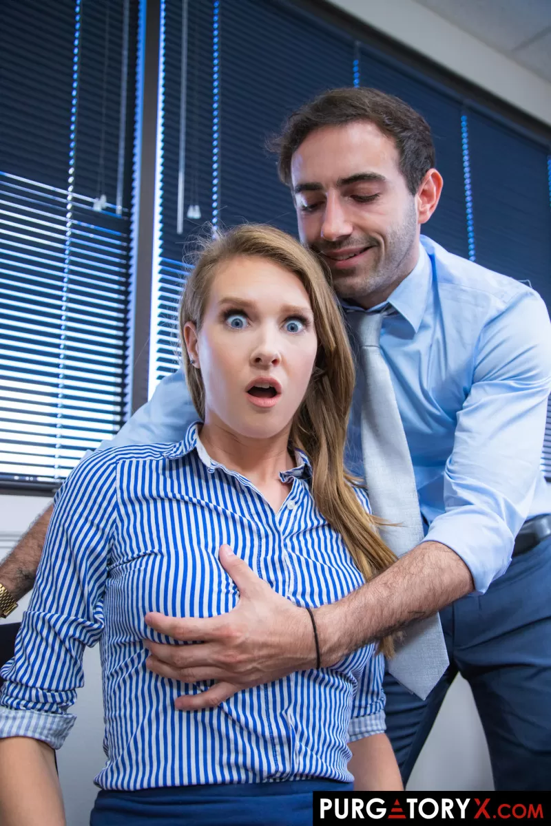 - 2. Горячая секретарша Эбигейл Би обнажает свои упругие сиськи на работе в колготках винного оттенка.