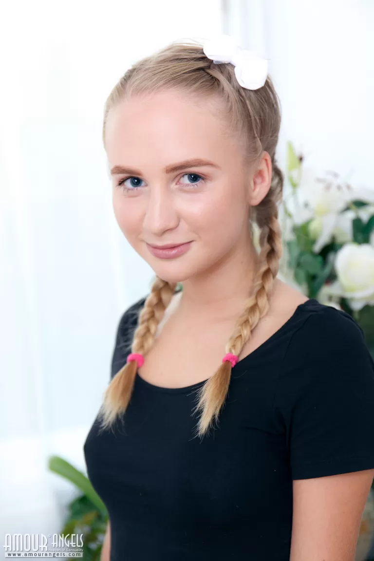 - 3. Симпатичная школьница Эбигейл снимает свой свитер, чтобы позировать в лифчике и колготках.