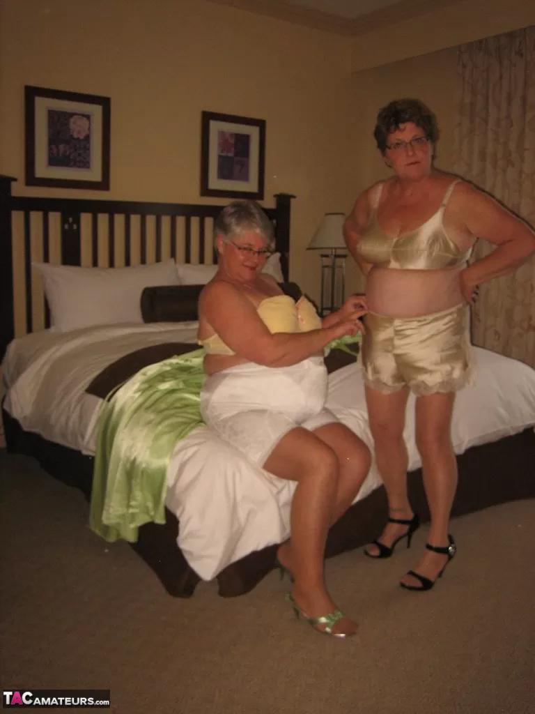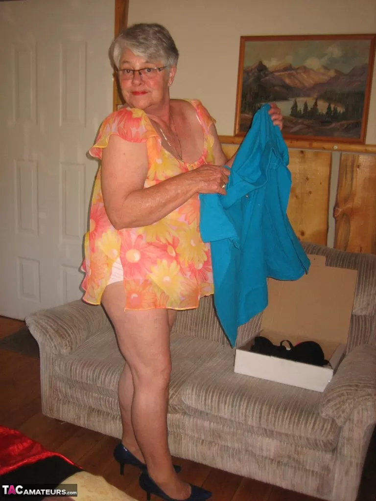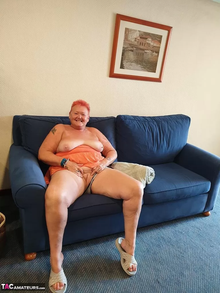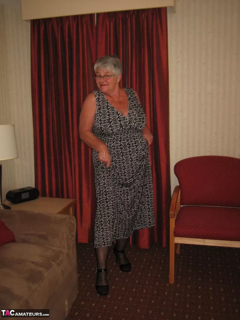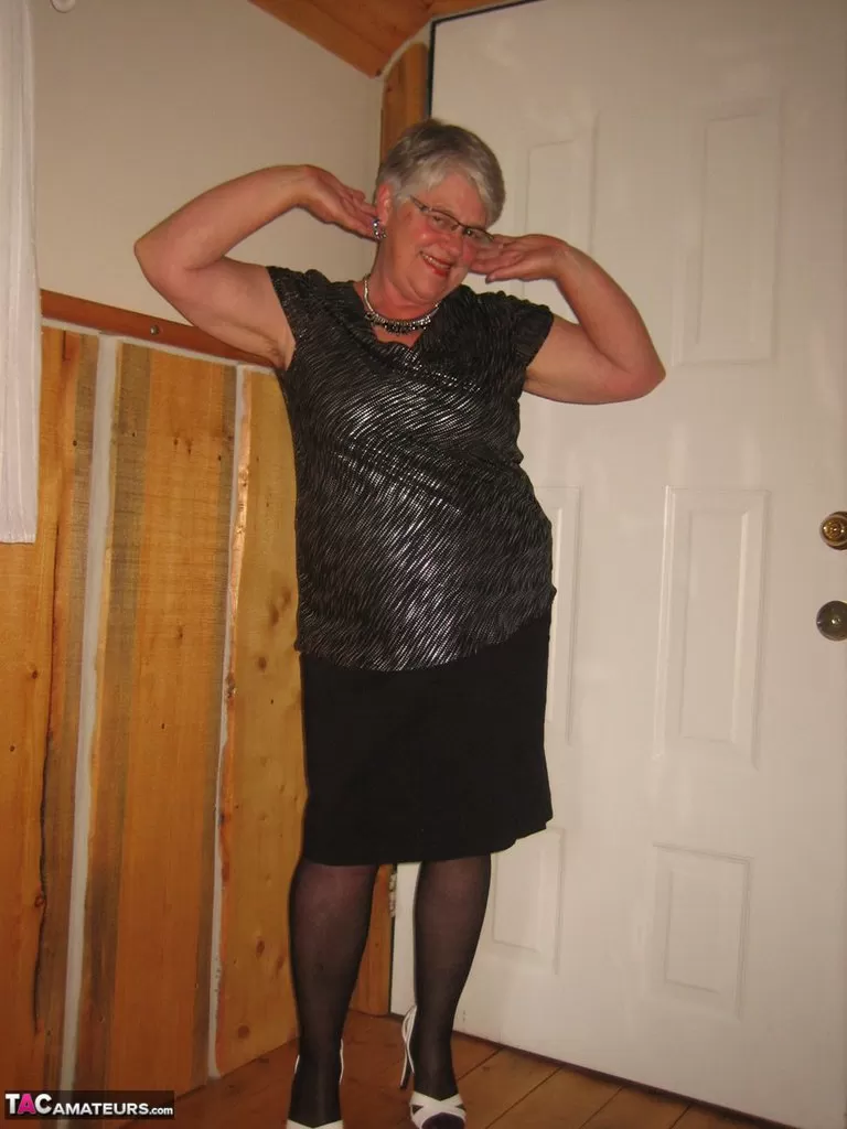 - 4. Толстая старуха Богиня пояса снимает черное нижнее белье, чтобы позировать обнаженной в чулках.