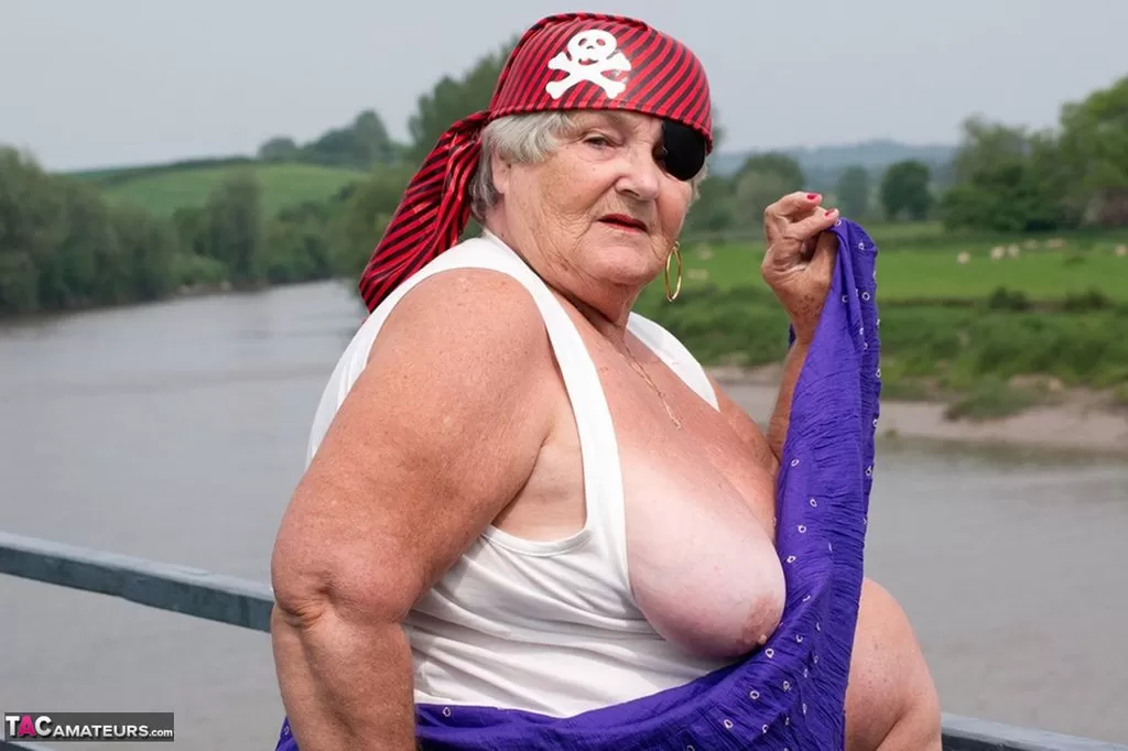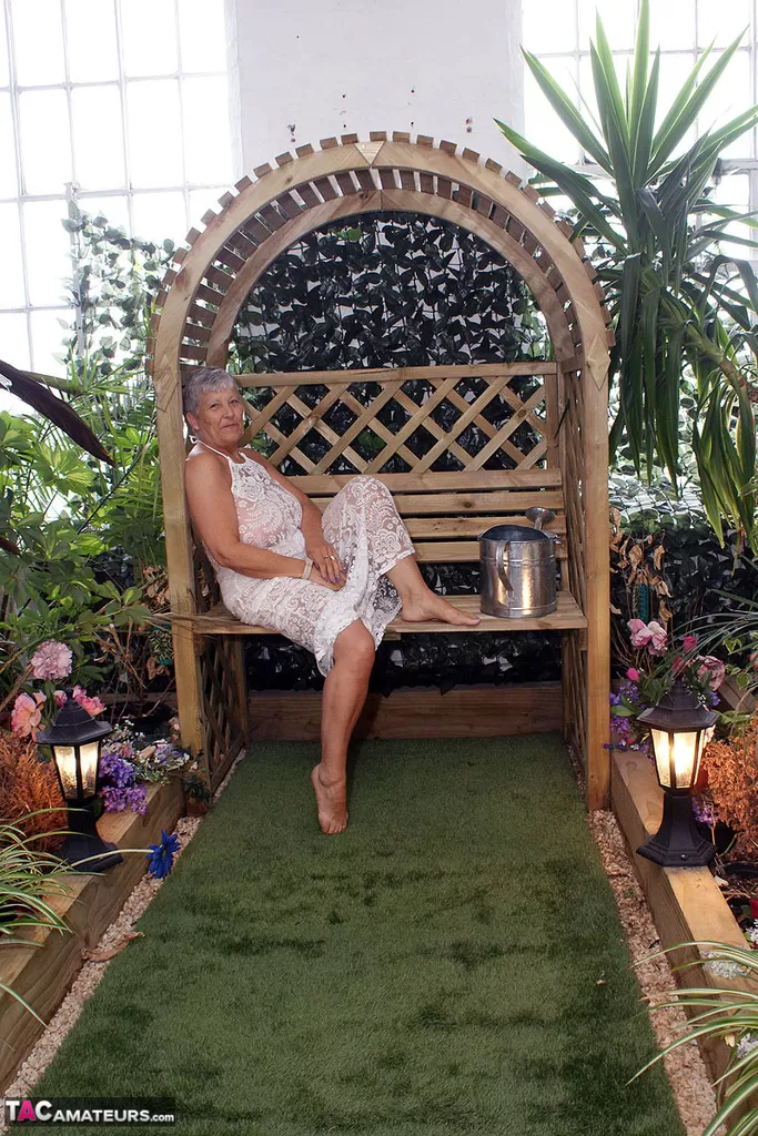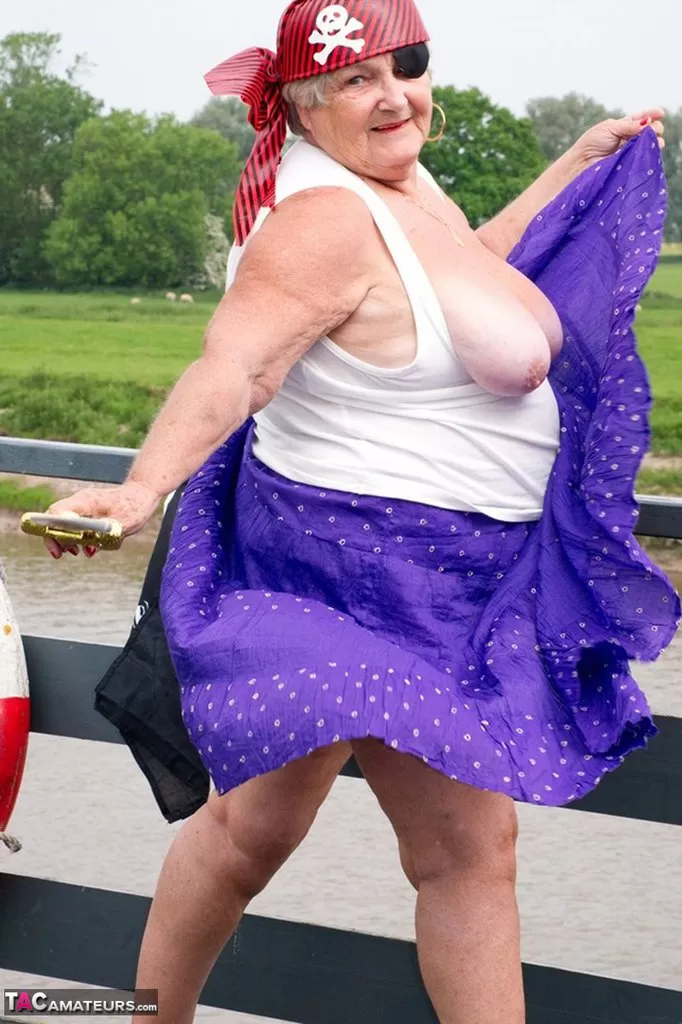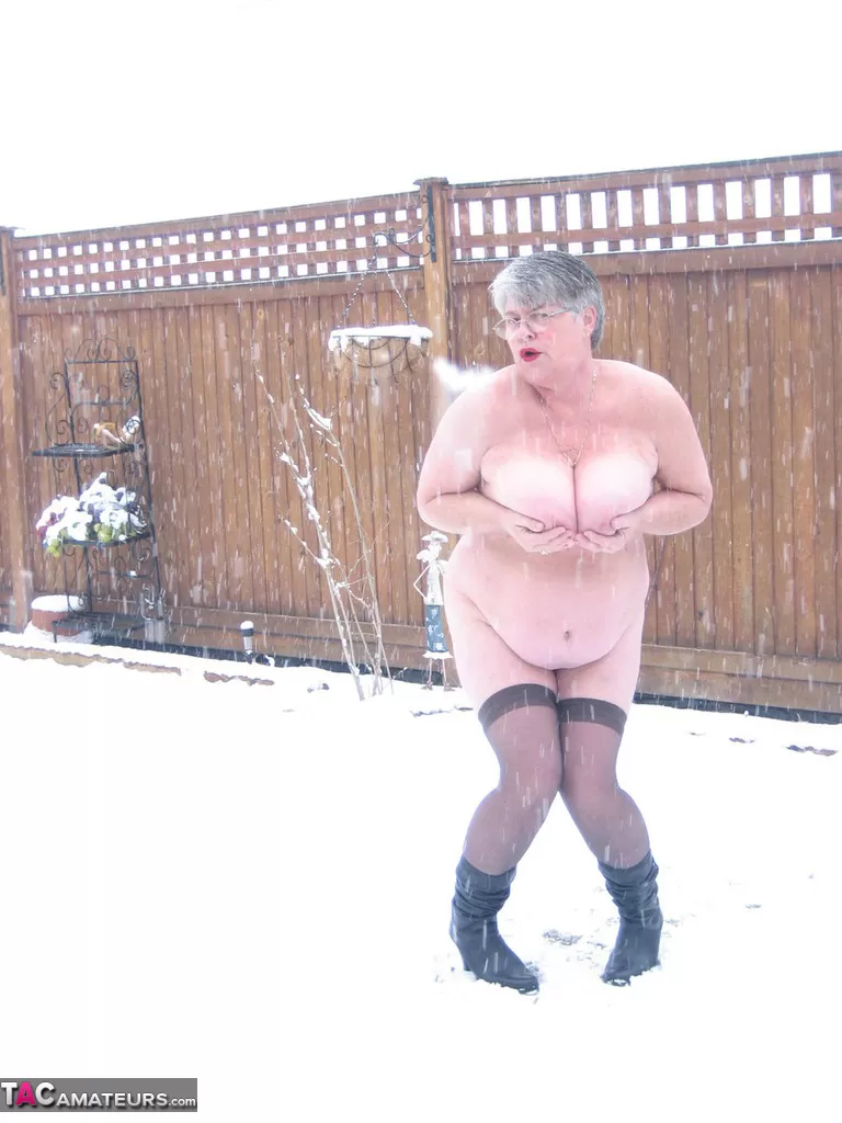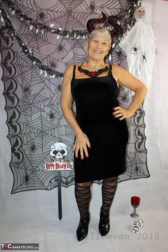 - 4. Толстая старуха Богиня пояса снимает черное нижнее белье, чтобы позировать обнаженной в чулках.