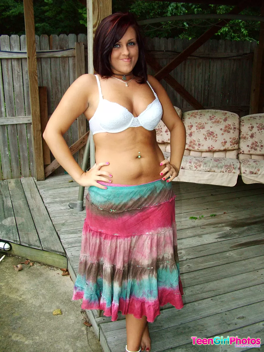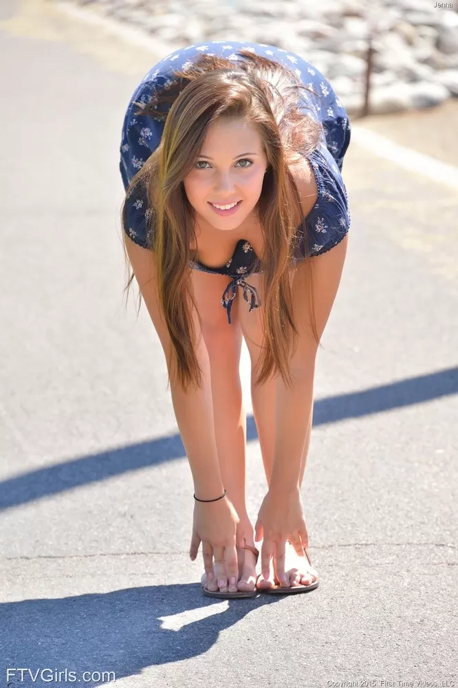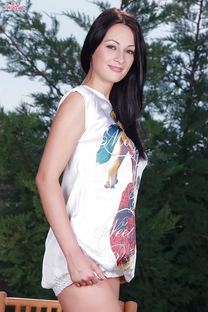 - 1. Потрясающая молодая блондинка с задорными крошечными сиськами обнажает свою бритую киску на открытом воздухе.