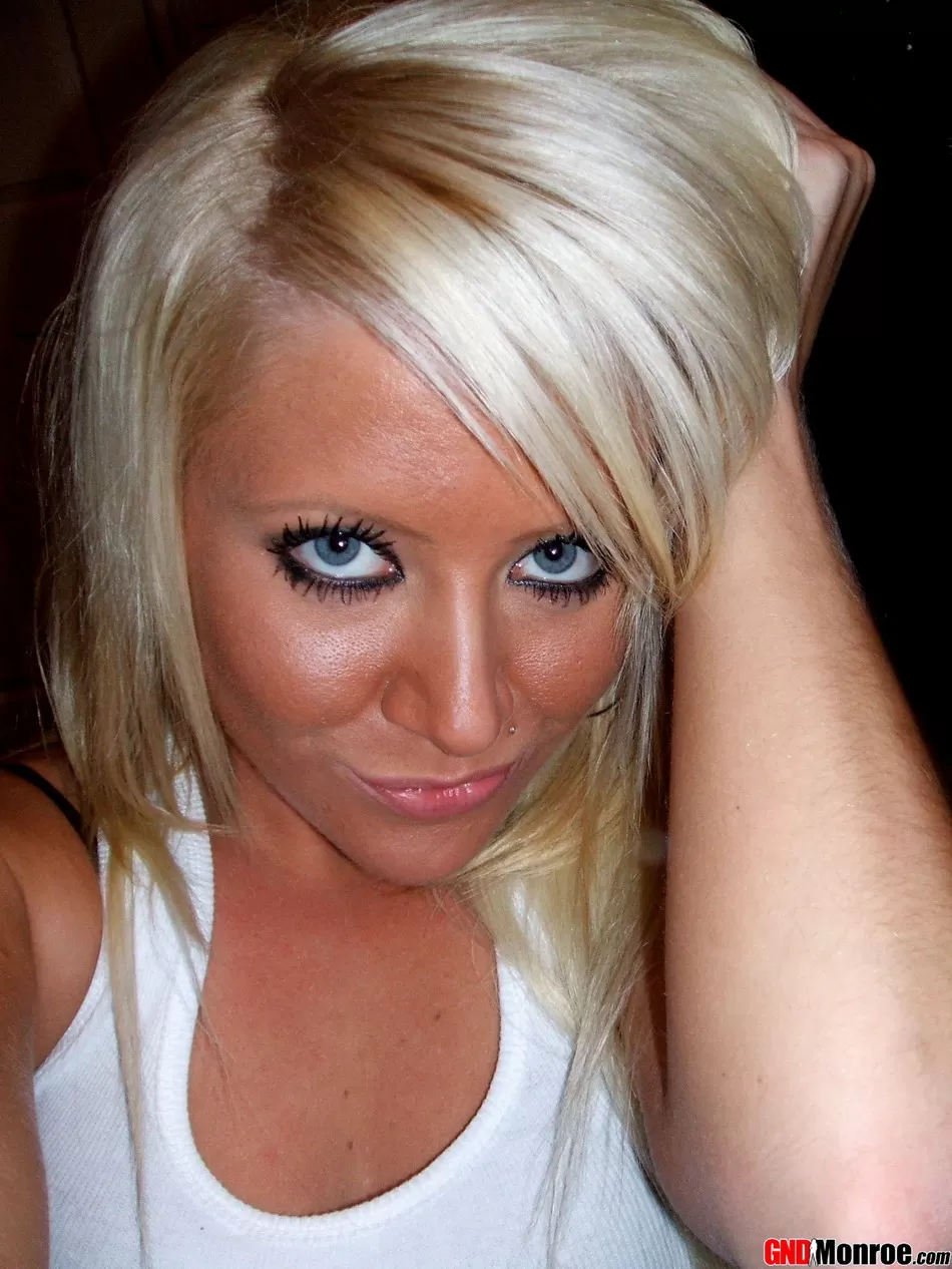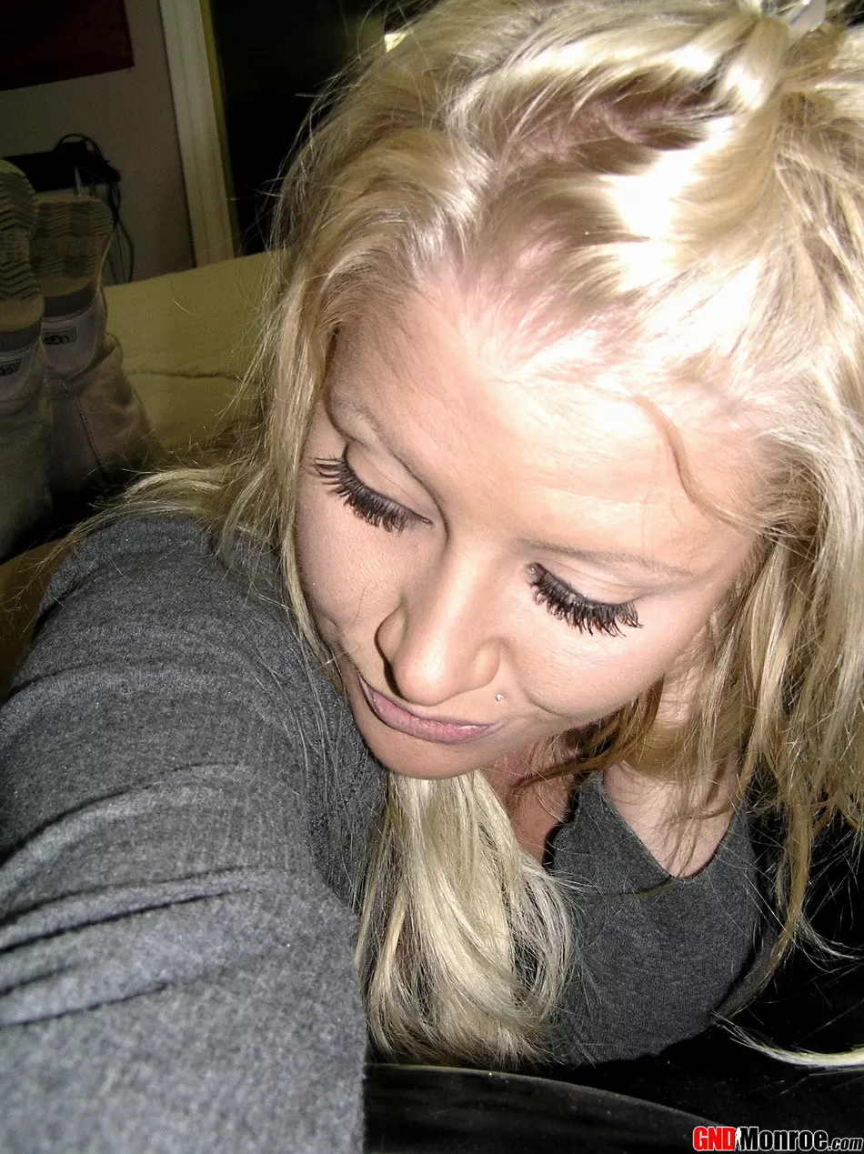 Беловолосая шлюха Монро Ли делает селфи со своими большими сиськами и голой пиздой