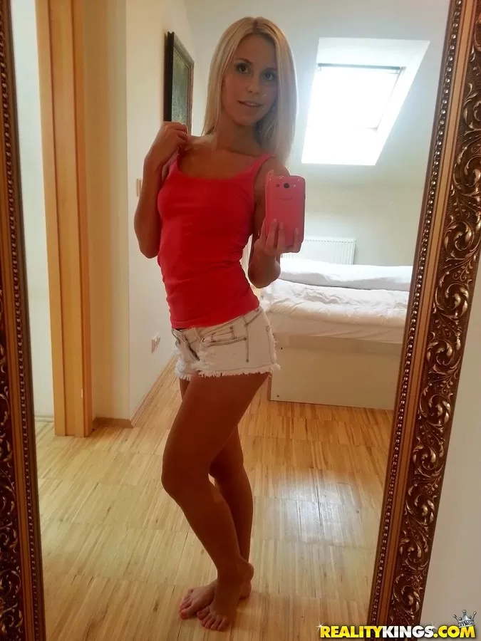 3. 3. Красивая белокурая шлюха Миша Кросс делает селфи полностью одетая и совершенно голая.
