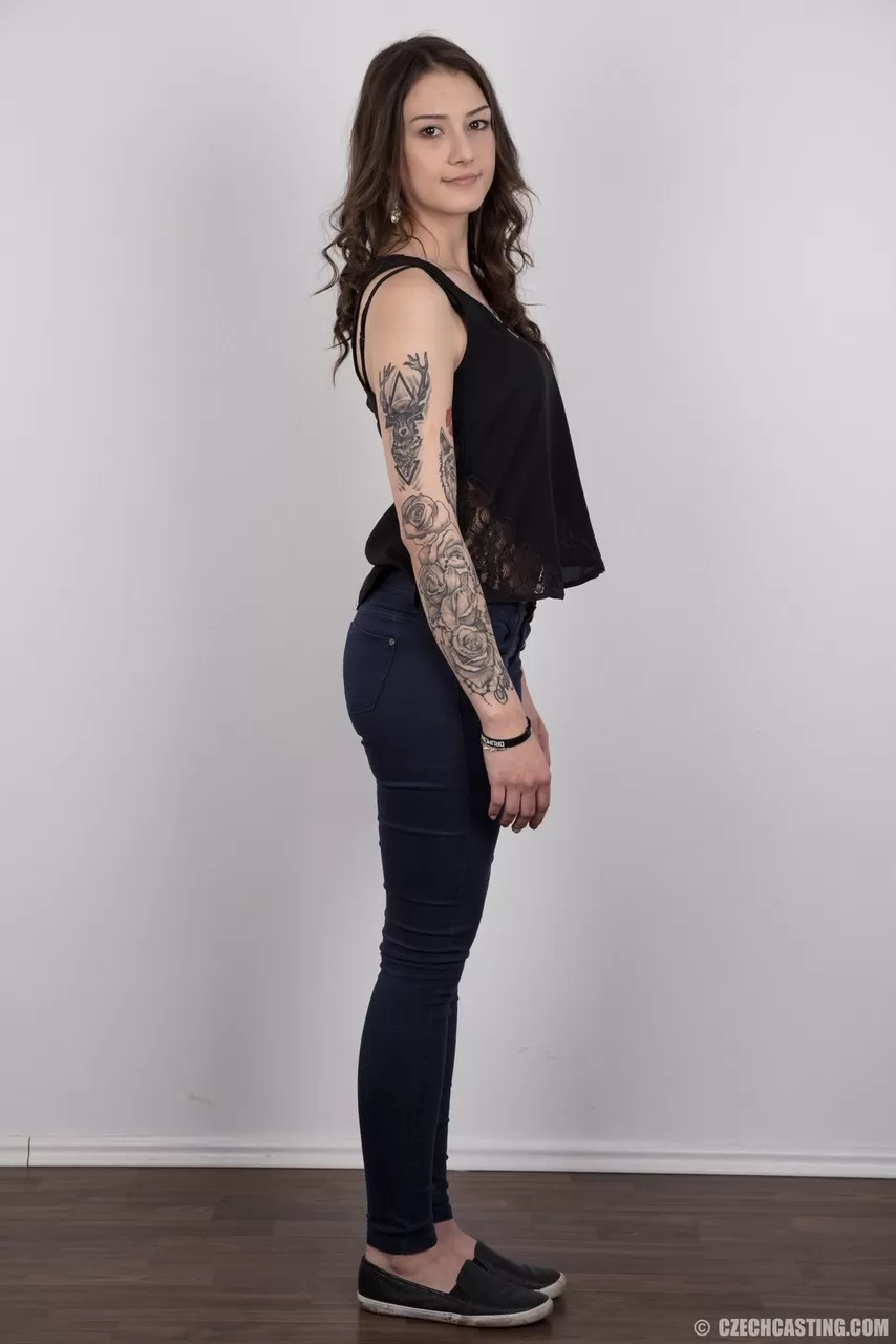 - 1. Молодая модель-любитель снимает рваные джинсы по пути к обнаженной модели.