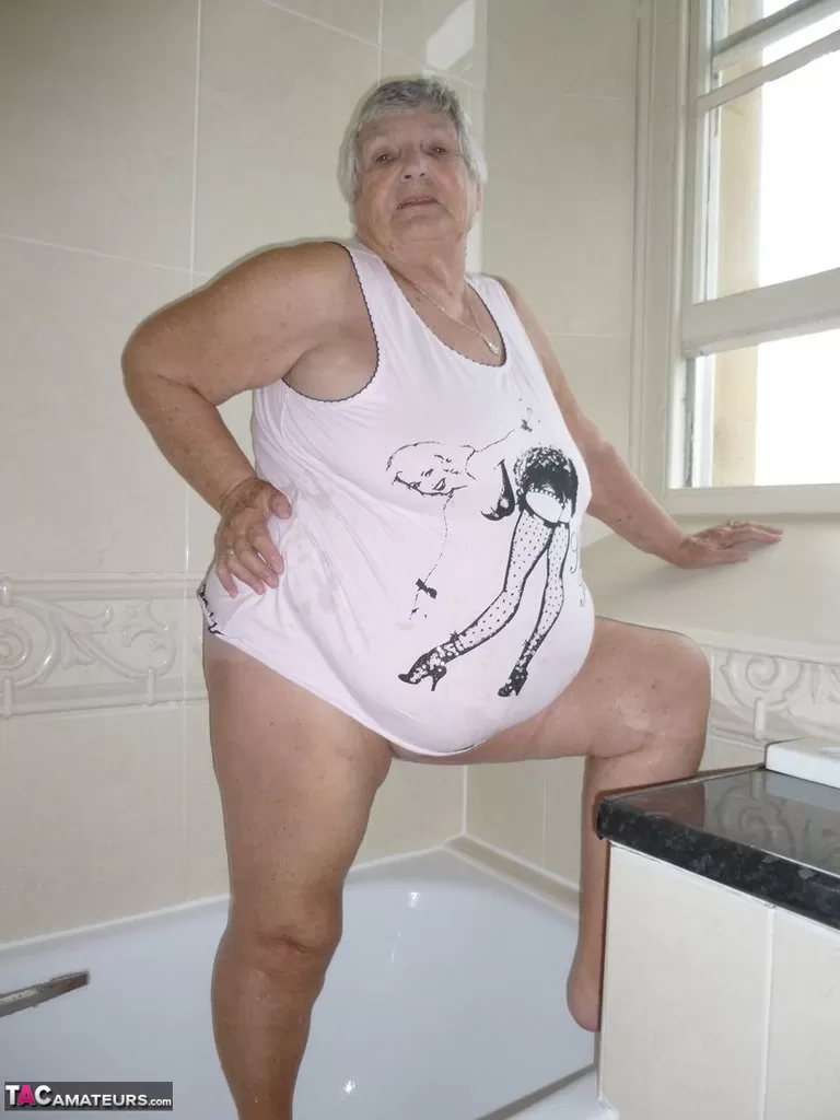 - 4. Тучная бабуля Либби раздевается в чулках во время принятия душа.