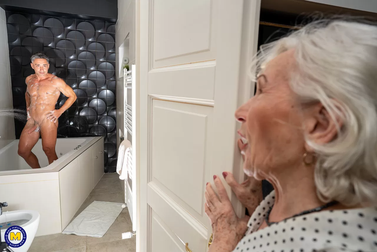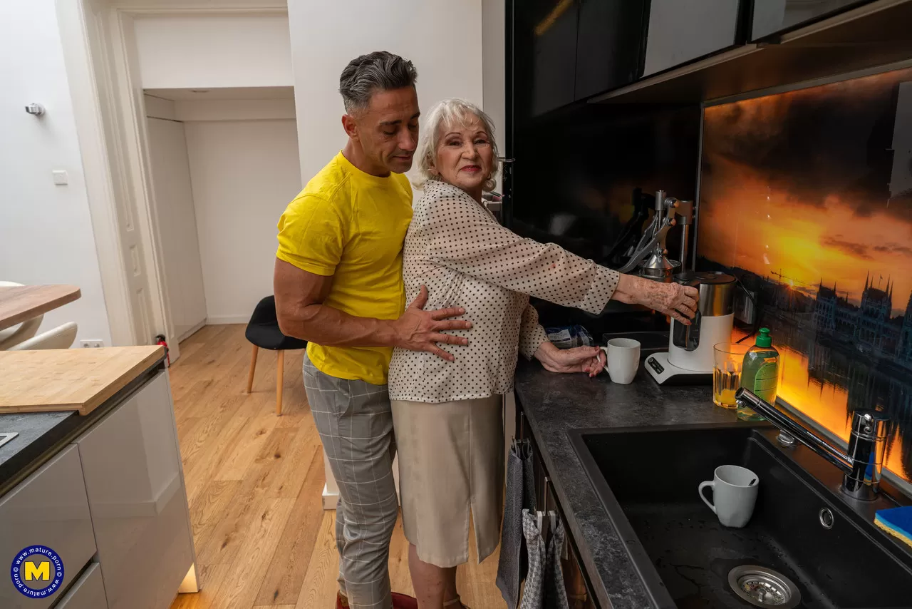 Бабуля с платиновой блондинкой соблазняет своего молодого любовника, пока он