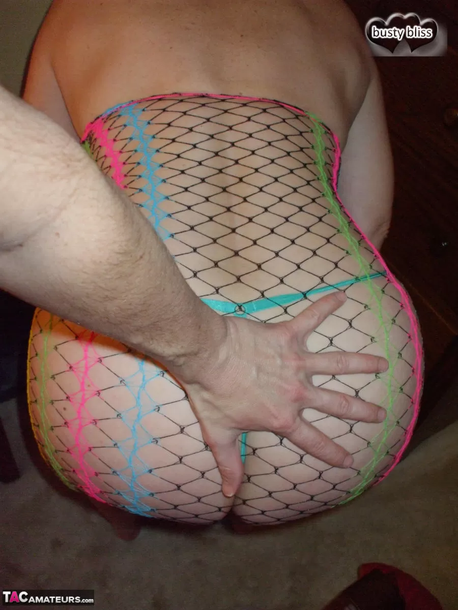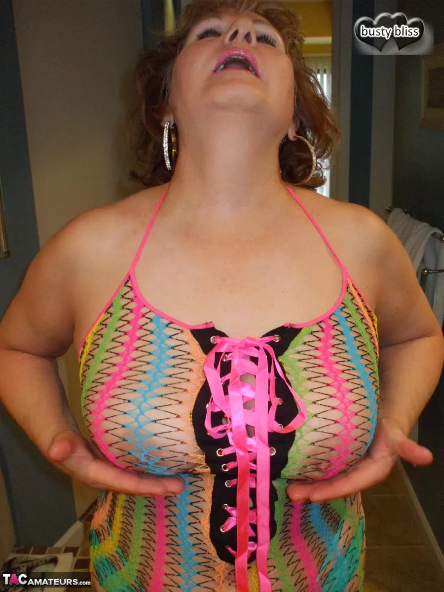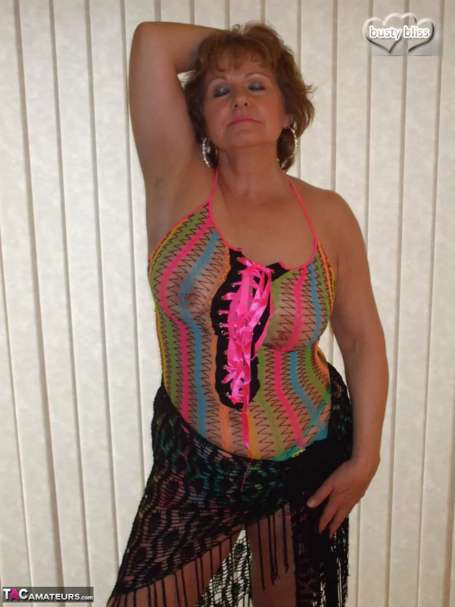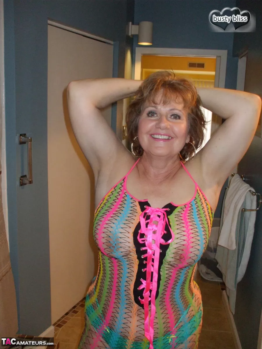 Рыжеволосая бабуля грудастая Блисс обнажает свою киску в прозрачн