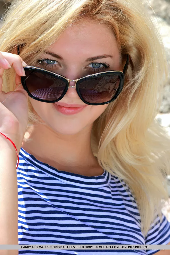 » Молодая блондинка Кэнди А сбрасывает солнцезащитные очки и одеж