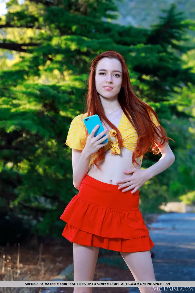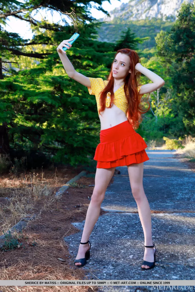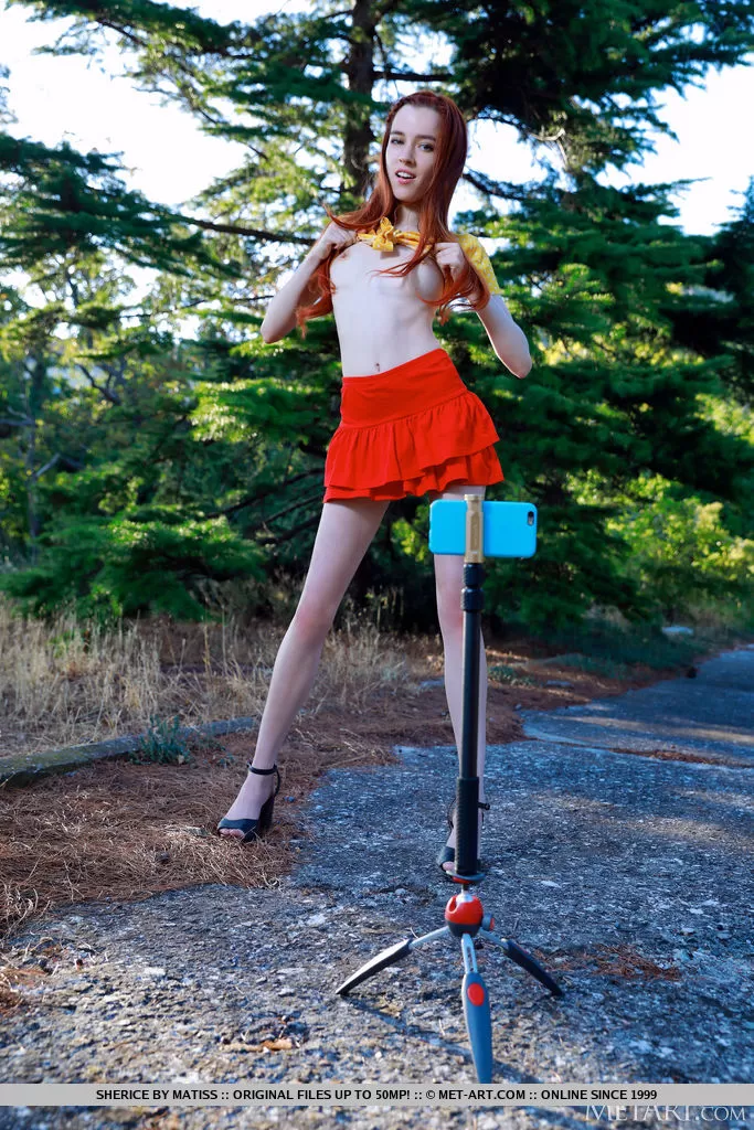 Молодая рыжеволосая Шерис полностью раздевается после того, как делает селфи на лесной