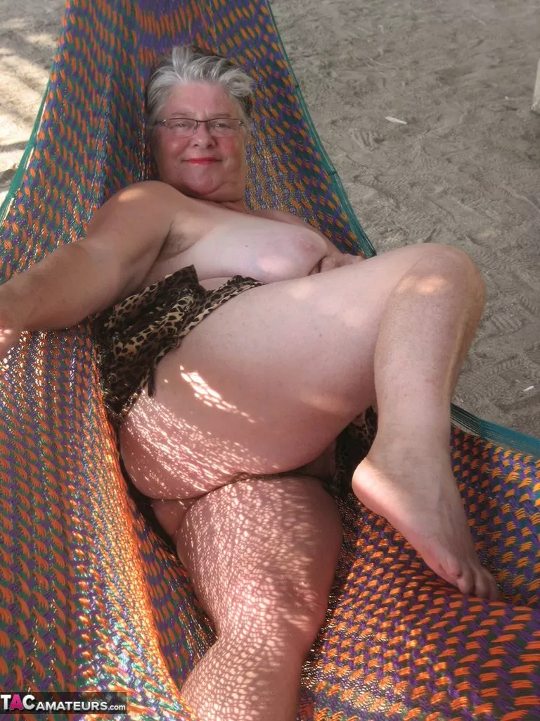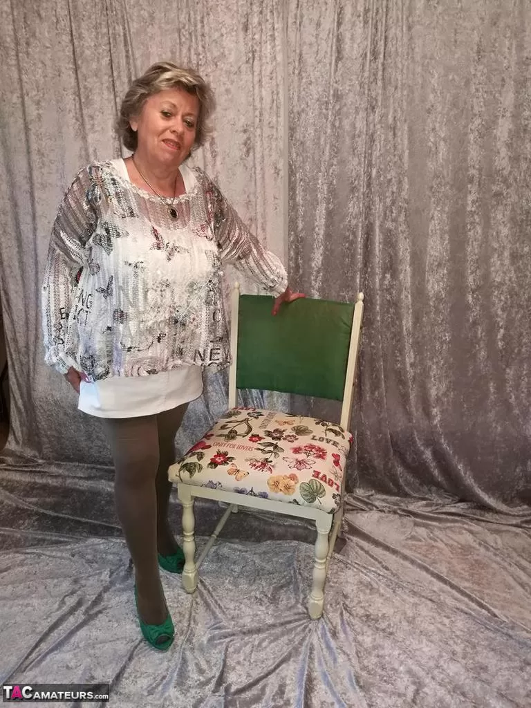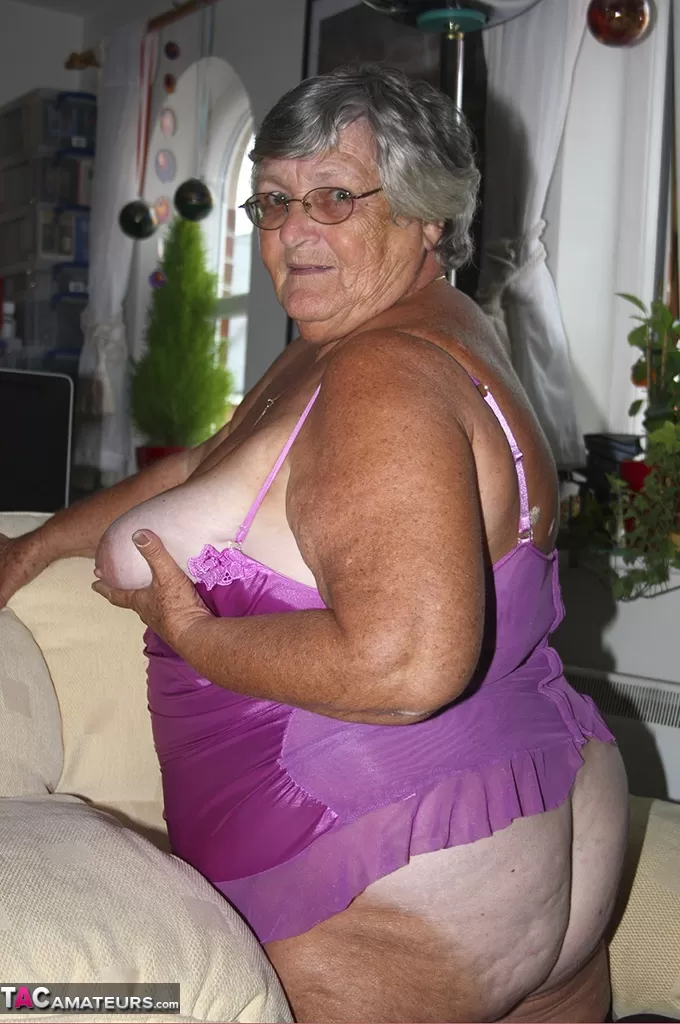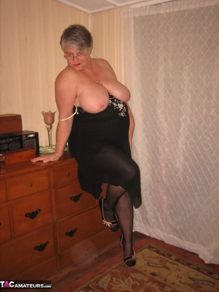 - 1. Толстая старуха Банни Грэм раздвигает свою киску, сняв каблуки и чулочно-носочные изделия.