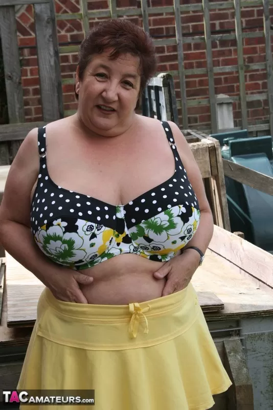 - 1. Толстая модель Дженни Ноубл обнажает свои огромные сиськи из бикини во внутреннем дворике у бассейна.