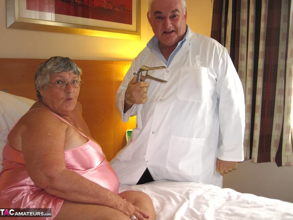 - 1. Зрелая гинекологиня снимает униформу, чтобы обнажить свое жирное тело и осмотреть свою пизду.