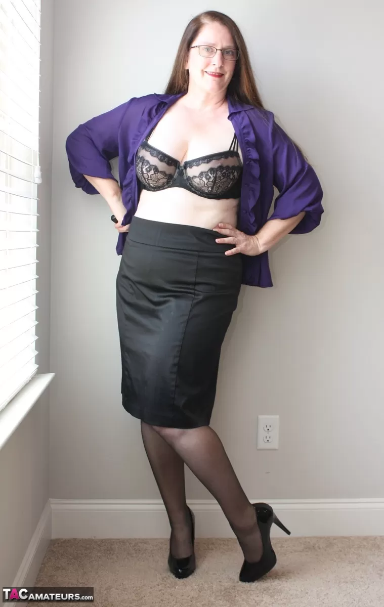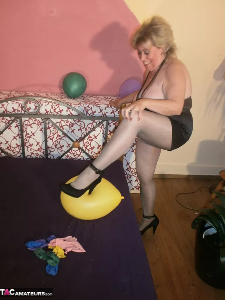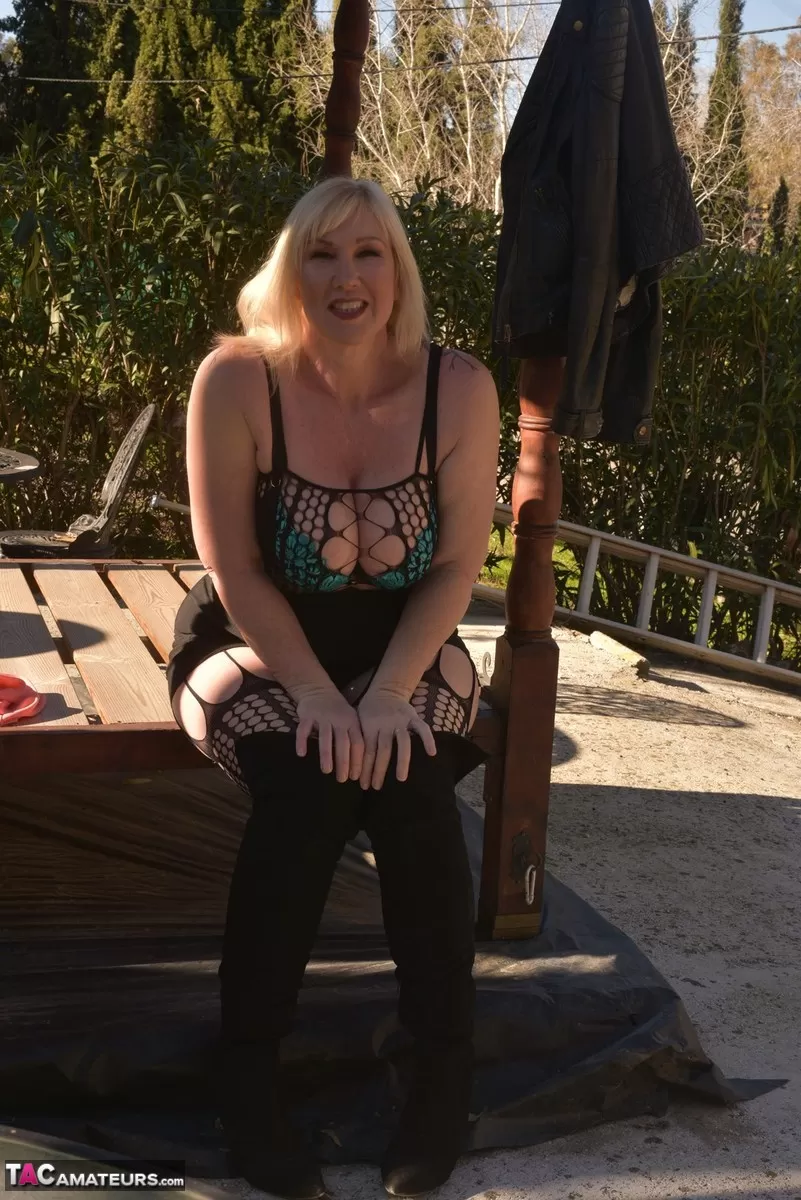 - 4. Толстая блондинка Бет Беннетт обнажает свои большие сиськи в колготках без промежности и на каблуках.