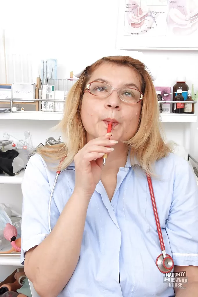 - 4. Толстая зрелая медсестра-гинеколог набивает свою бритую пизду зеркалом.