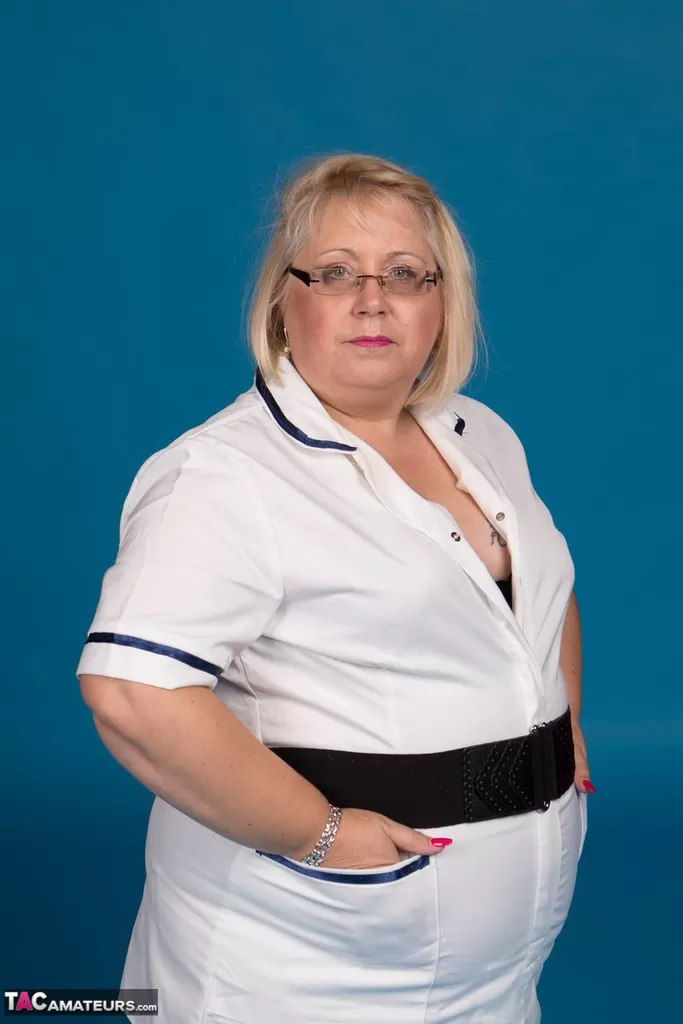 - 3. Медсестра SSBBW Элиза позирует на каблуках и в непослушной униформе медсестры.
