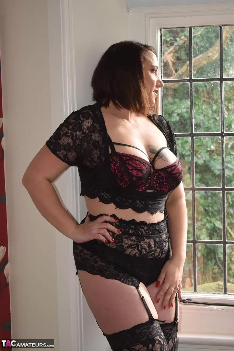 - 1. Британская любительница Джуси Джейни играет со своей киской в коричневых нейлоновых чулках.