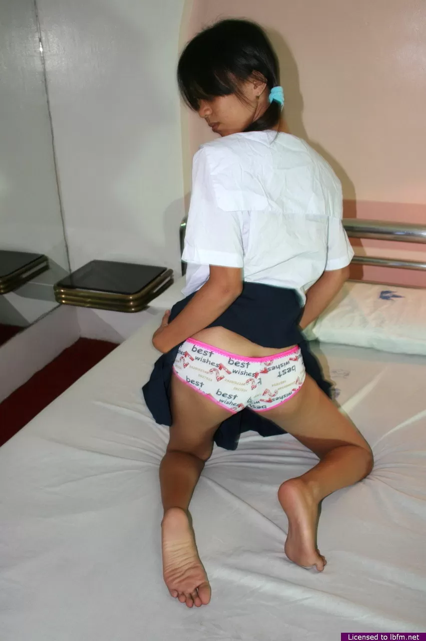 - 3. Молодая азиатка Эппл освободила свою лысую киску от белых хлопчатобумажных трусиков.
