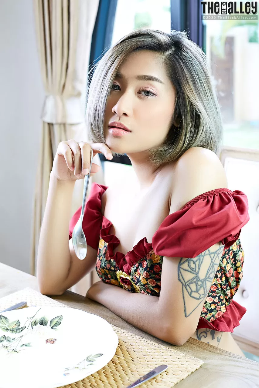 - 4. Азиатская соло-девушка Эппл трет свой куст о стол после того, как обнажилась топлесс.