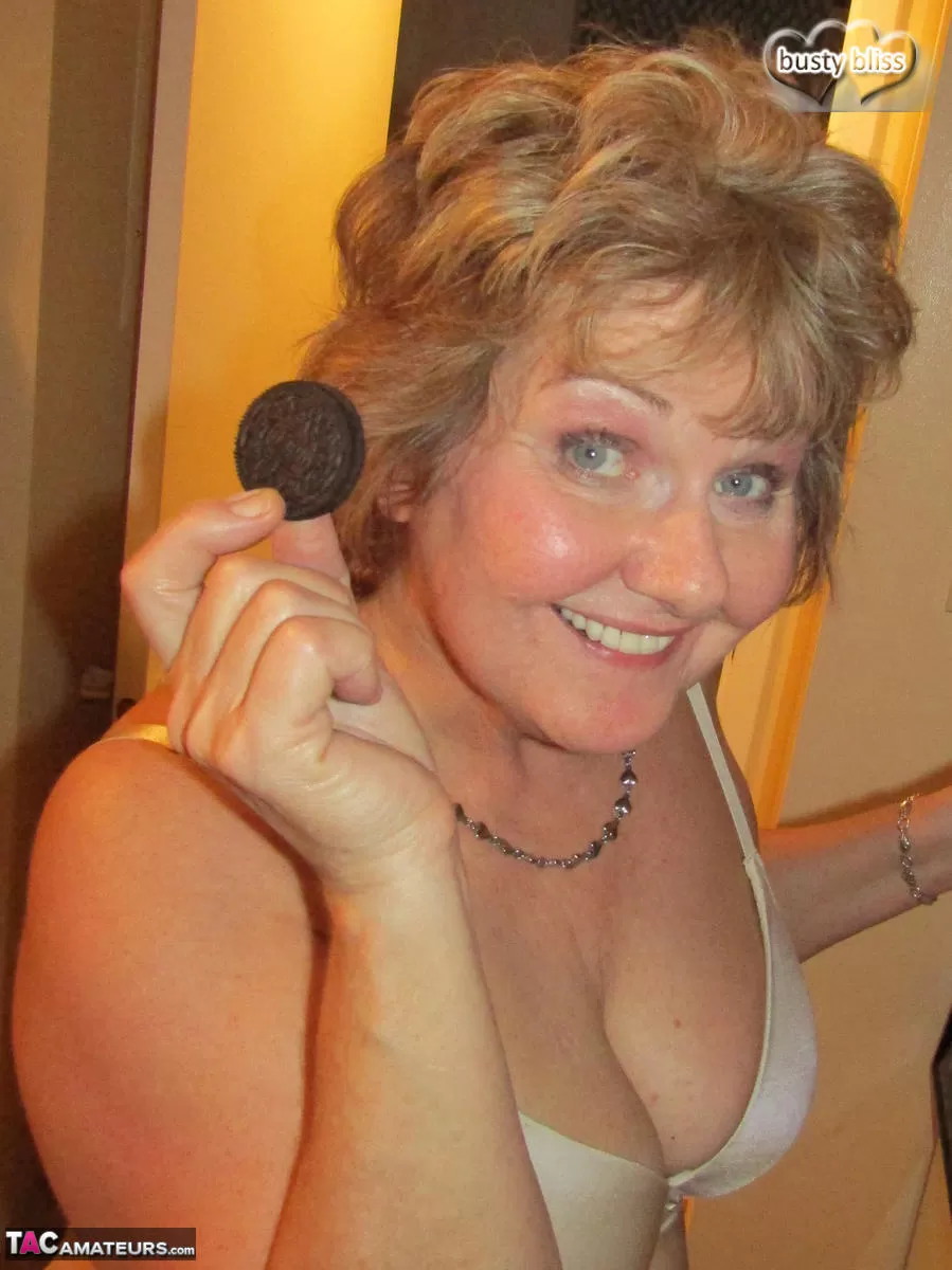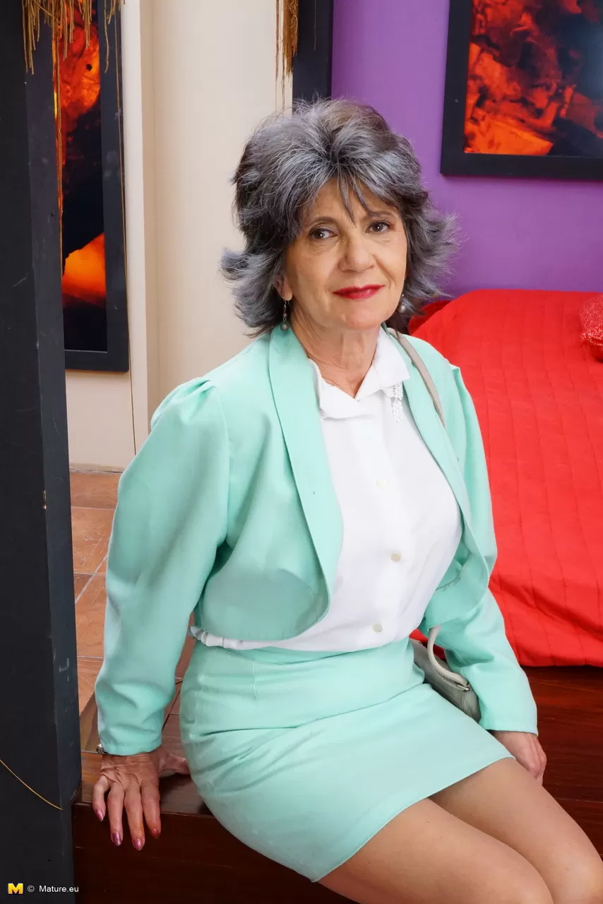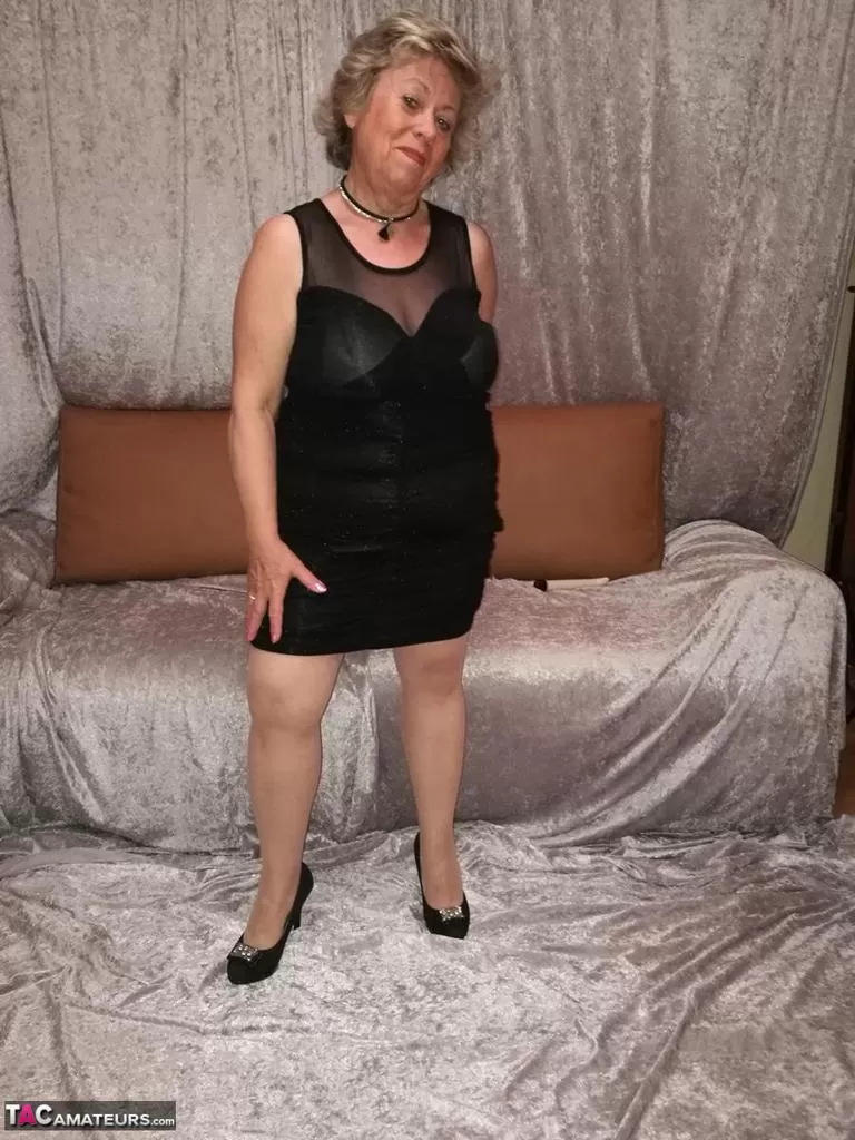 - 4. Непослушная бабушка с великолепными ногами раздевается до лифчика и нижнего белья.