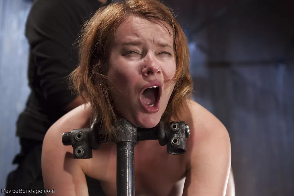 - 3. Толстая рыжеволосая клив с кляпом во рту привязана на четвереньках к кровати.