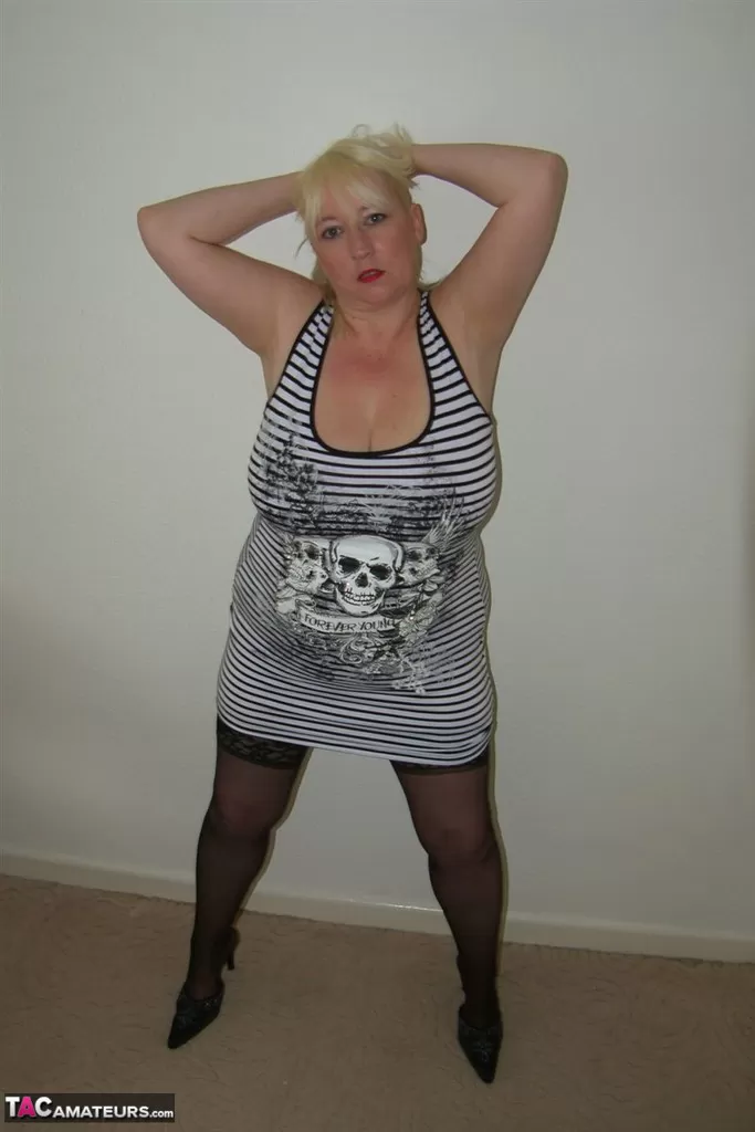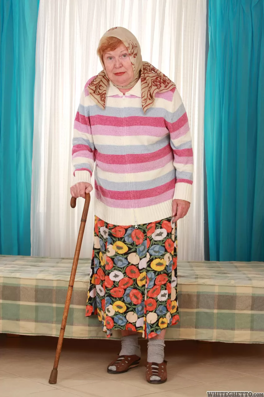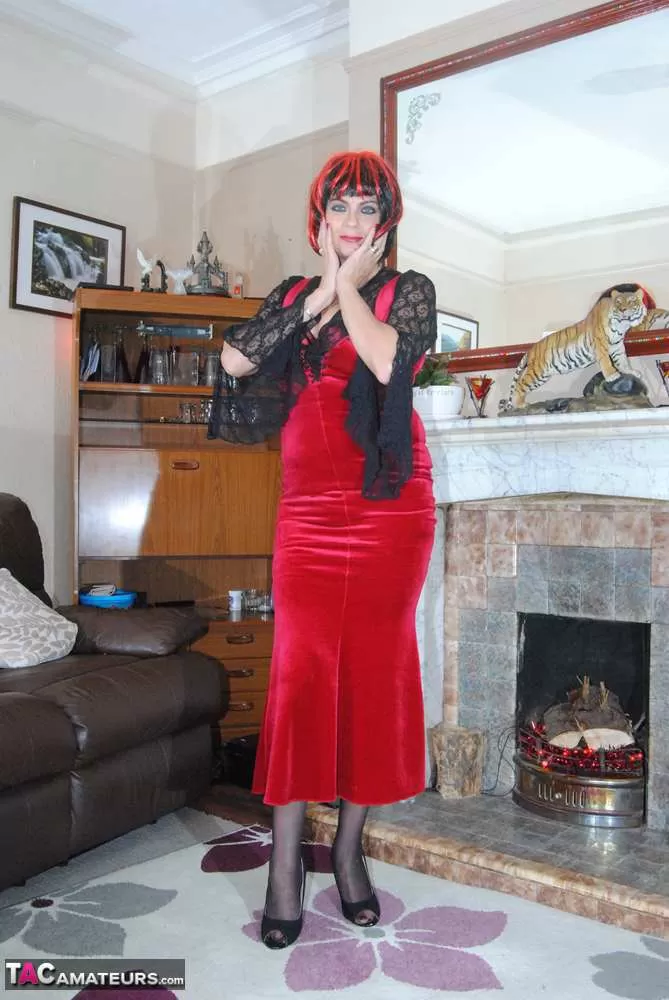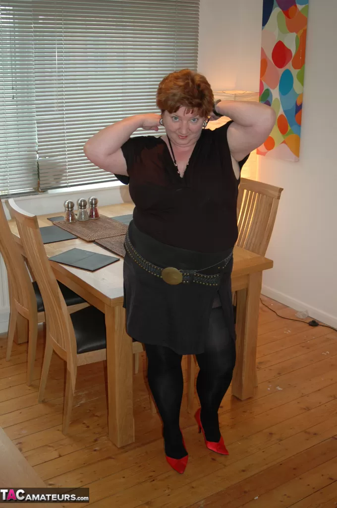 - 4. Пожилая леди с платиновыми светлыми волосами расхаживает не обнаженной в красном нижнем белье и на каблуках.
