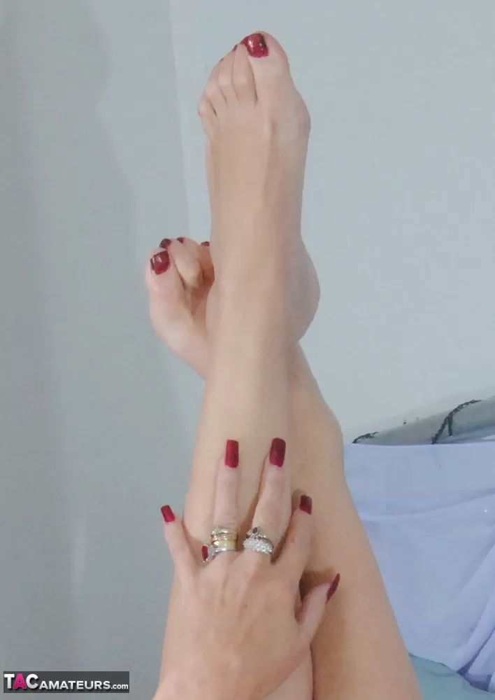 - 3. Зрелая женщина Брэнди Свит снимает свое красное платье и туфли на каблуках, чтобы позировать обнаженной.
